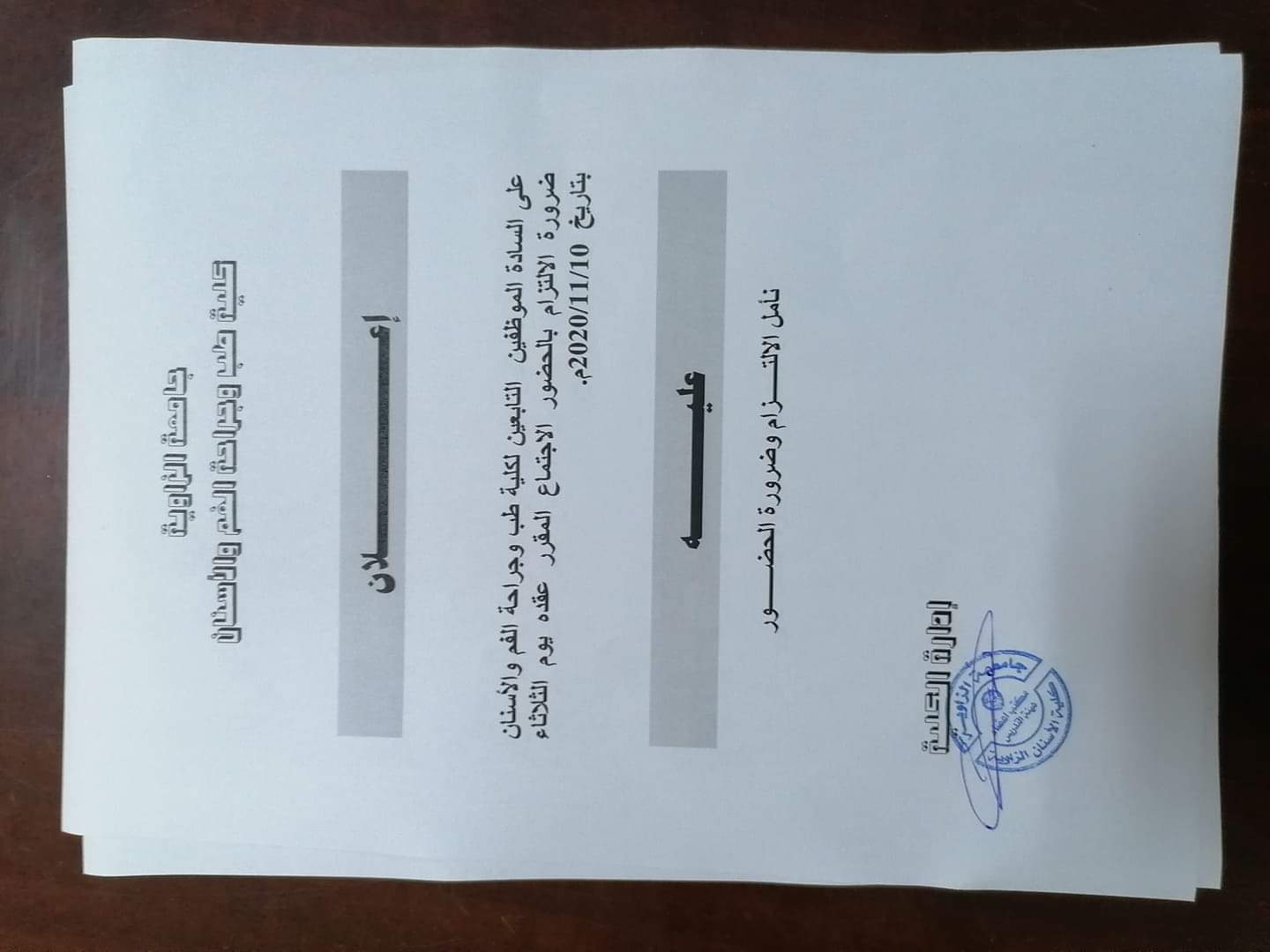 علي السادة الموظفين التابعين لكلية طب وجراحة الفم والأسنان بالزاوية ضرورة الإلتزام بالحضور الاجتماع المقرر عقدة يوم الثلاثاء بتاريخ 10_11_2020 وللأهمية الرجاء التقيد بالحضور مع مراعاة الاتباع بالإجراءات الوقائية.