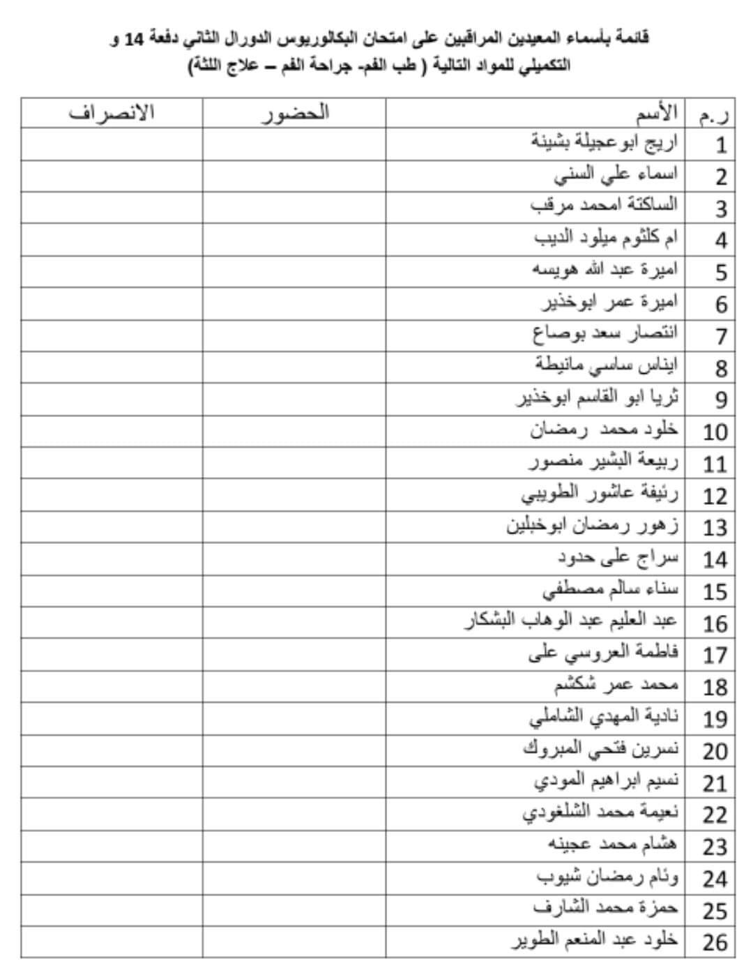 قائمة بأسماء المعيدين المراقبين على امتحان الدور الثاني لطلبة السنة الرابعة الدفعة 14 والتكميلي
