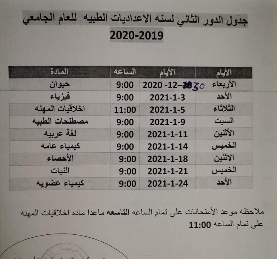 جدول الدور الثاني لطلبة الاعداديات الطبيه للعام الجامعي 2019 2020