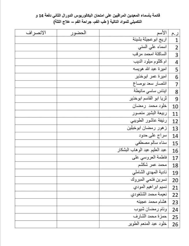 قائمة بأسماء المعيدين المراقبين على امتحان الدور لمادة جراحة الفم
