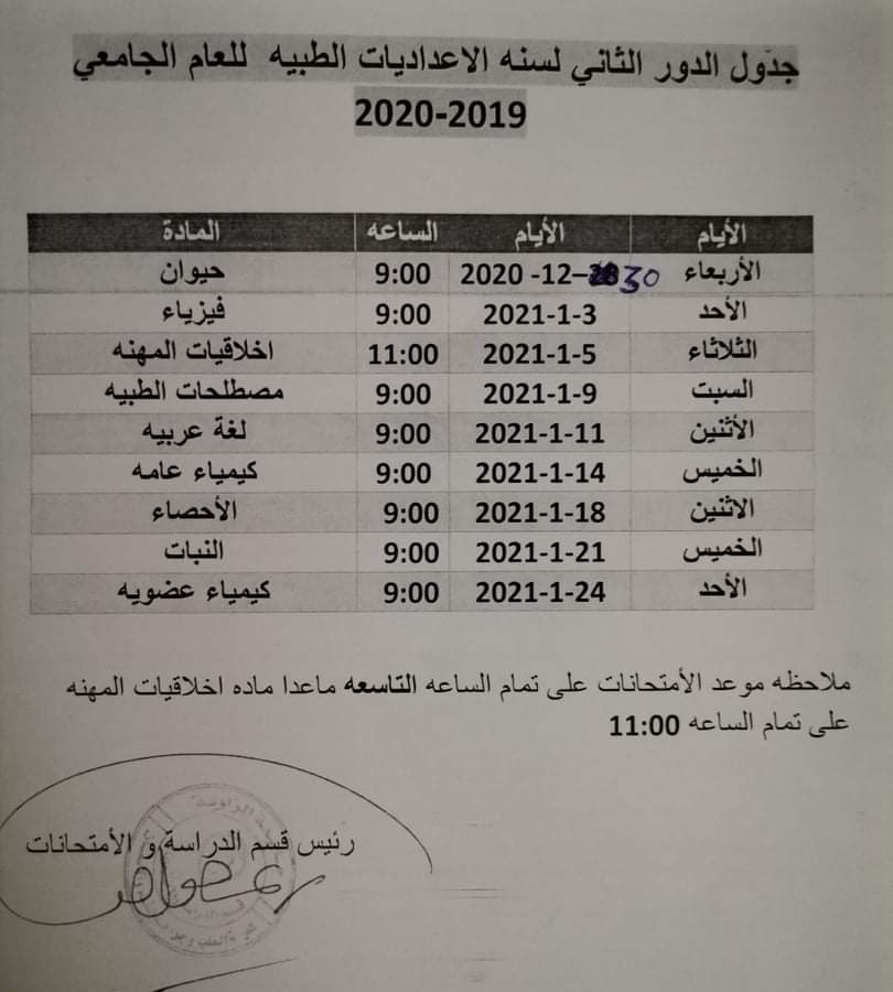 جدول الاعداديات الطبيه (طب الأسنان) الدور الثاني