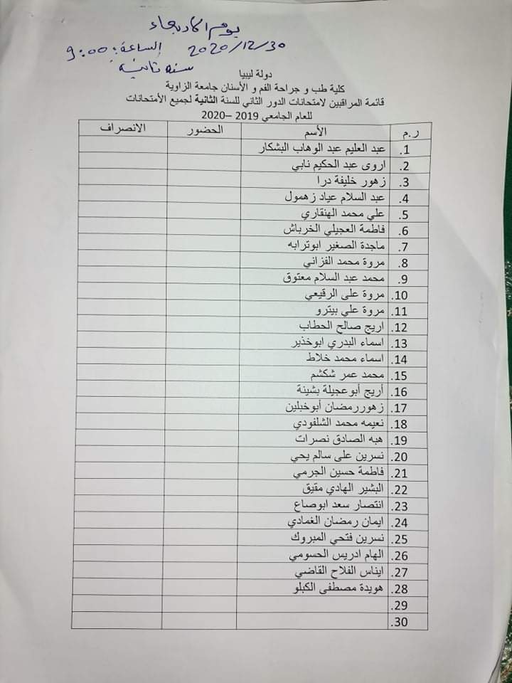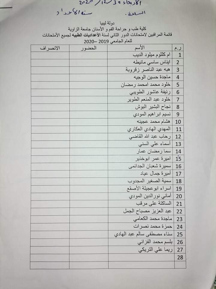 قائمة المعيدين المراقبين على امتحان الدور الثاني السنة الثانيه والاعداديات الطبية ليوم غذا الأربعاء القادم الموافق 30 / 12 / 2020 على تمام الساعه 9