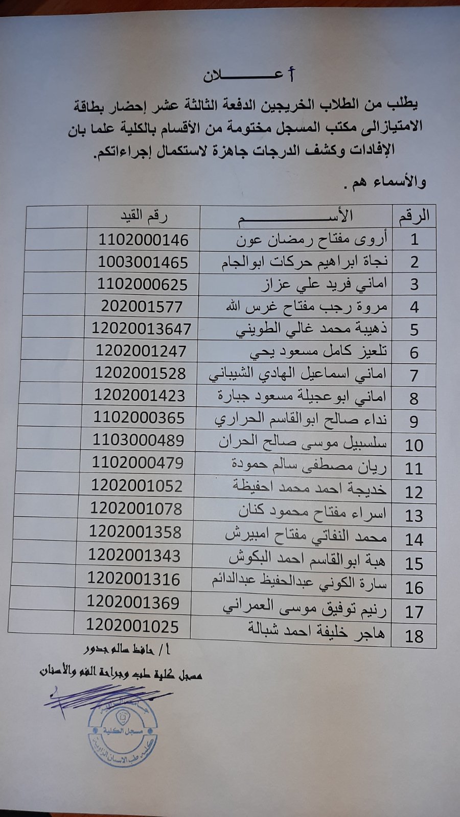 يطلب من الطلاب الخريجين الدفعة13 إحضار بطاقة الإمتياز إلى مكتب المسجل مختومة من الأقسام بالكية علما بأن الافادات وكشف الدرجات حاضرة لاستكمال إجراءاتكم