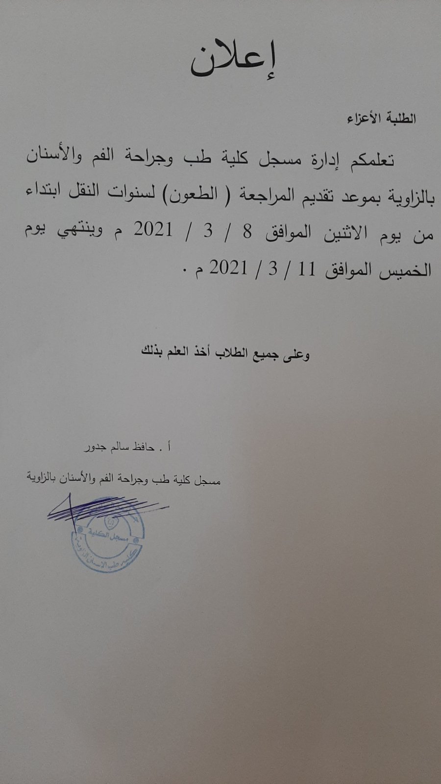 تعلمكم إدارة كلية طب وجراحةالفم والأسنان بالزاوية بموعد تقديم المراجعة (الطعون) لسنوات النقل إبتداء من يوم الأثنين الموافق 8/3/2021 م وينتهي يوم الخميس الموافق 11/3/2021م.