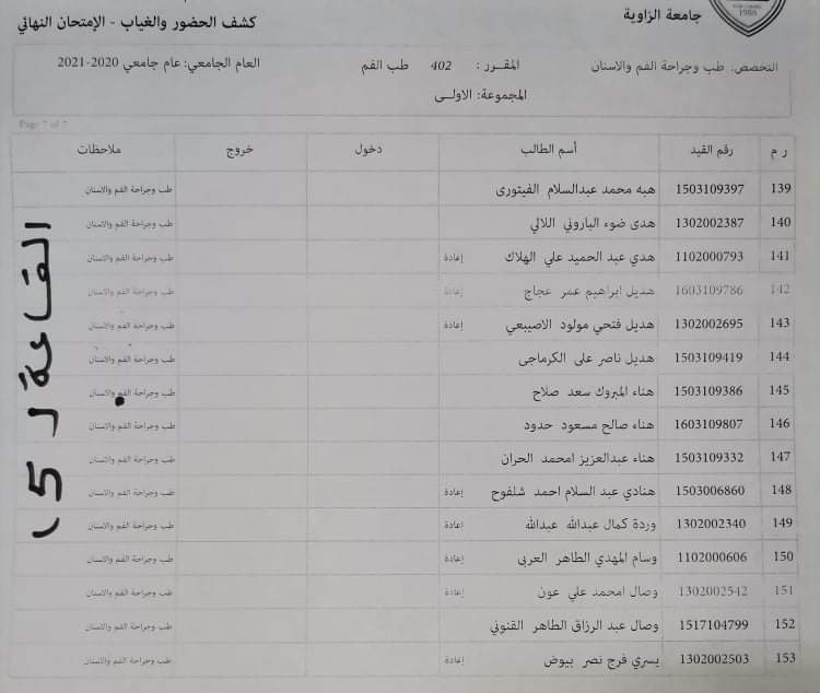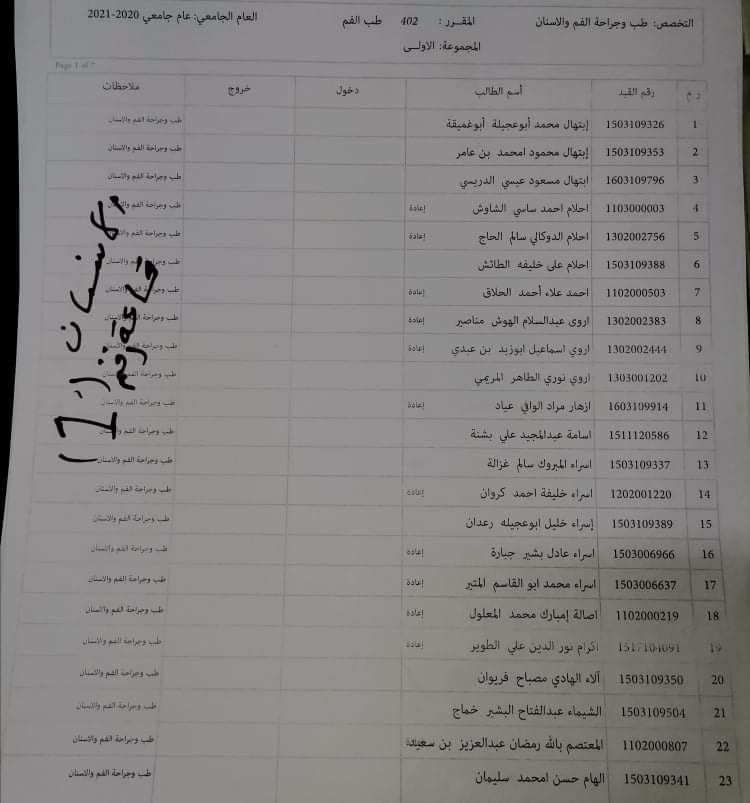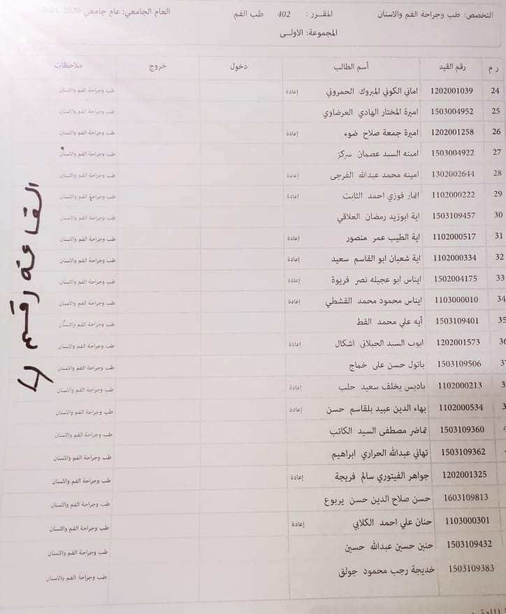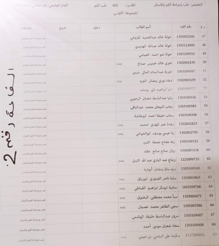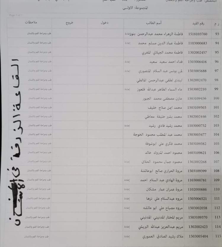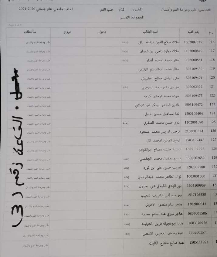 قوائم طلبه السنه الرابعه الدفعه 15 والتكميلي لامتحان مادة طب الفم ليوم الأحد القادم الموافق 13 / 6 / 2021 على تمام الساعة9:00 يرجى الإلتزام بالإجراءات الوقائية ويمنع دخول اي طالب دون ارتداء الكمامه وإحضار بطاقة التعريف ،،بالتوفيق للجميع