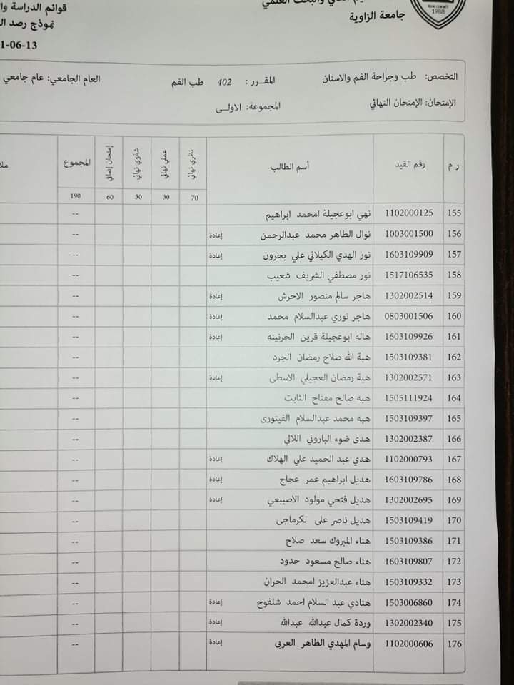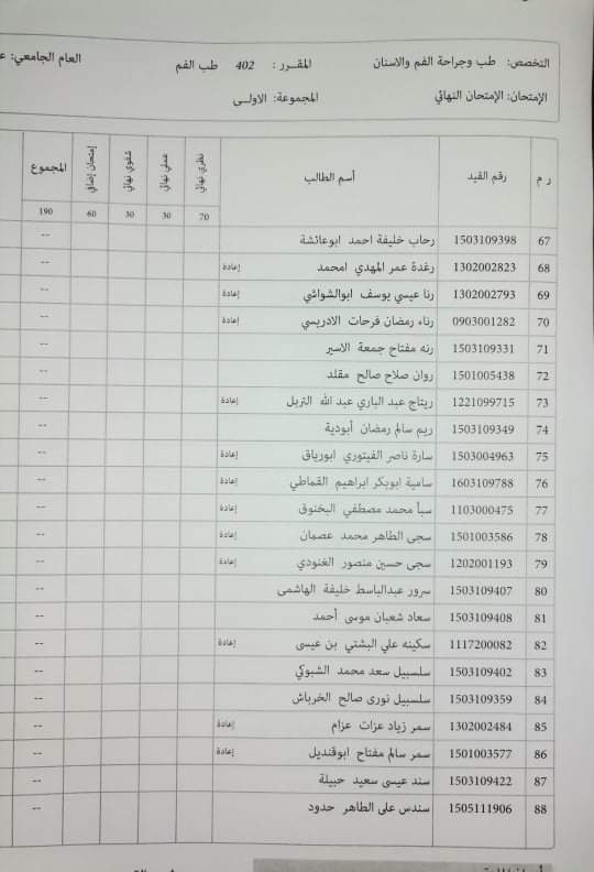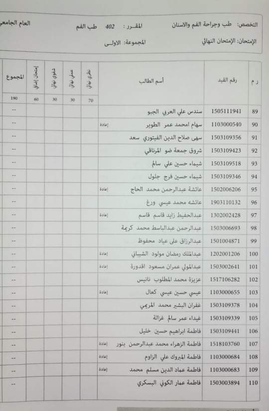 قوائم الطلبه للامتحان العملي ليوم غذا الاثنين لمادة طب الفم ،،المجموعه الأولى من رقم 1الي 90،،حسب التسلسل في القائمة من الساعه 9:00 الي 11:30 ،،،المجموعه الثانيه من رقم 91الي اخر القائمة من الساعه 11:30 إلى الساعه 2:00