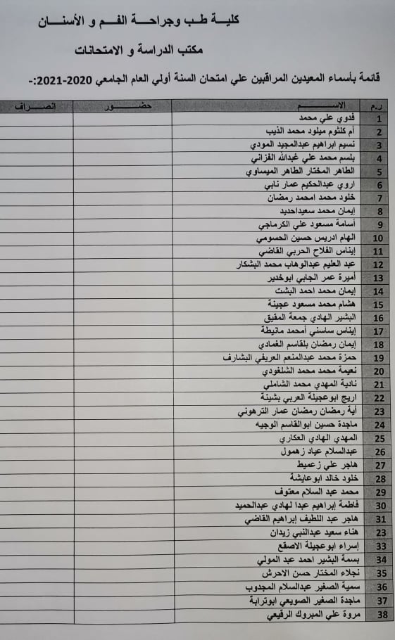 قائمة المعيدين المراقبين على امتحان الدور الأول السنة الأولى للعام الجامعي 2020 /2021 ابتدأ من يوم الأربعاء القادم الموافق 16/ 2 / 2022 على تمام الساعه 9 ،،يرجى الإلتزام بالحضور للأهمية