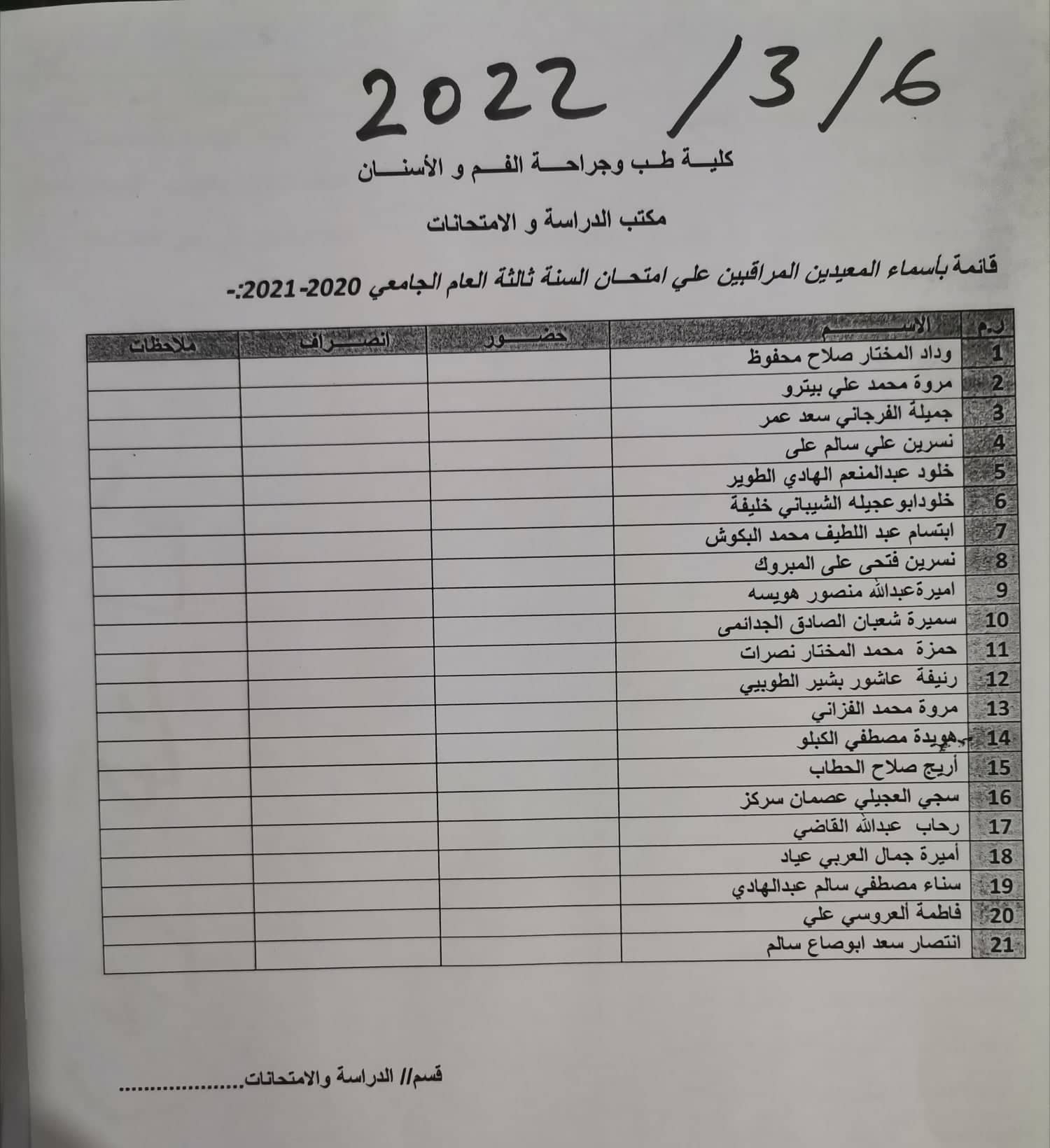 قائمة المعيدين المراقبين على امتحان الدور الأول السنة الثالثة لجميع المواد