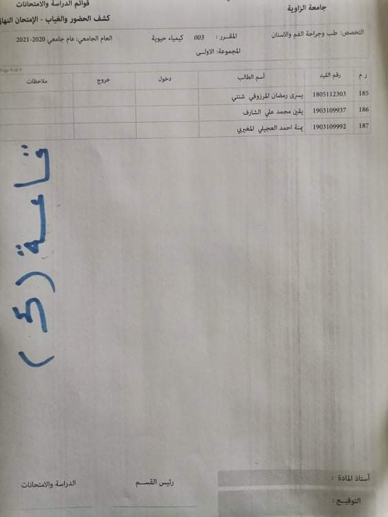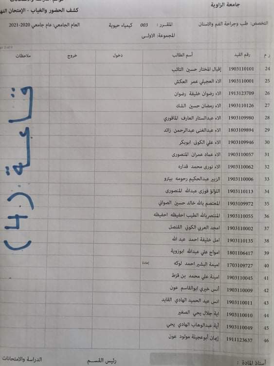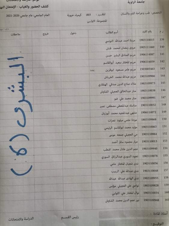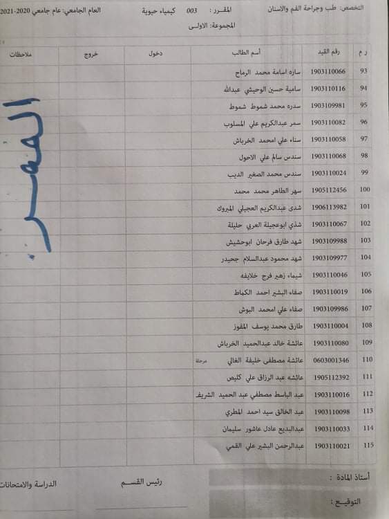 توزيع القاعات للامتحان الدور الأول لمادة الكيمياء الحيوية
