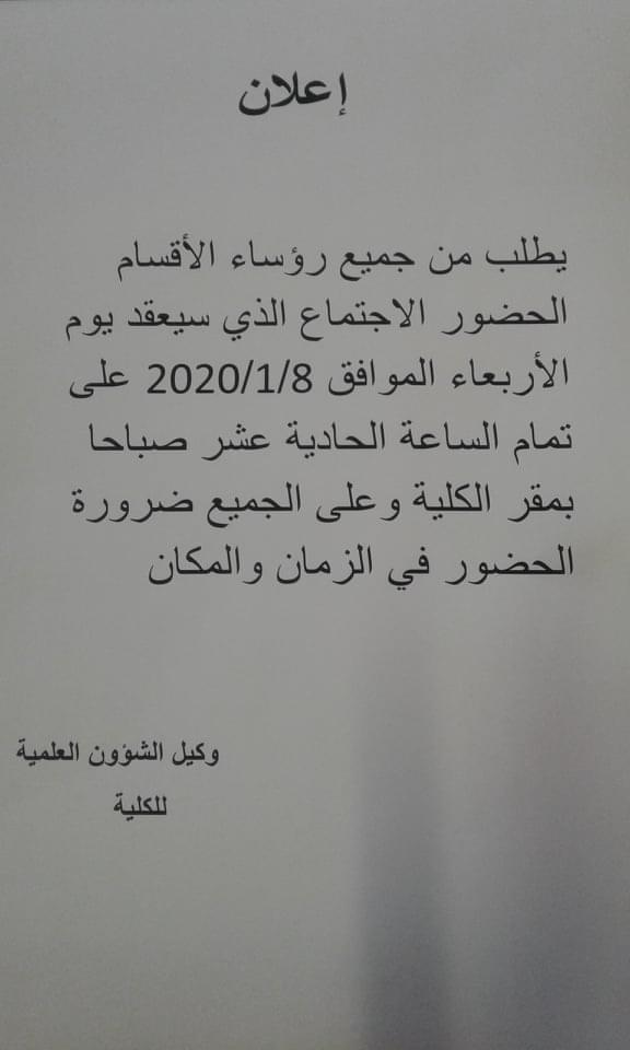 يطلب من جميع رؤساء الاقسام حضور الاجتماع المقرر عقده غدا الاربعاء بالكلية على تمام الساعة الحادية عشر صباحا. ويرجى من الجميع الحضور بالزمان والمكان المحددين.