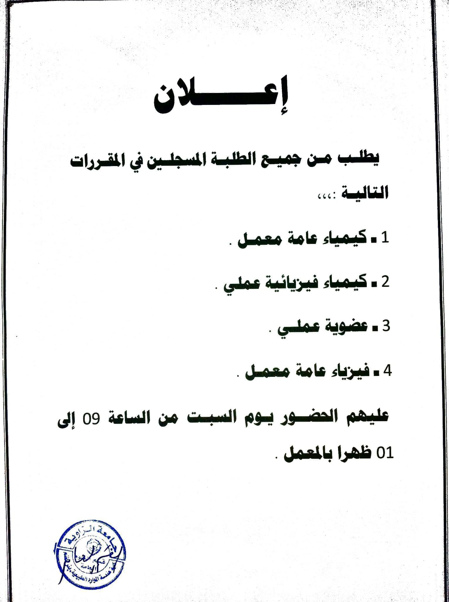 إعلان هام لكل طلبة المعامل