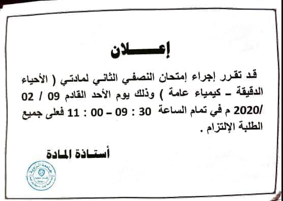 إعلان بخصوص الامتحان النصفي الثاني لمقررات ( الأحياء الدقيقة - الكيمياء العامة )