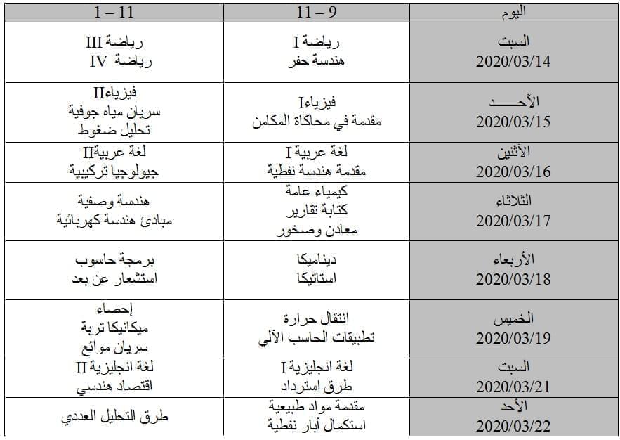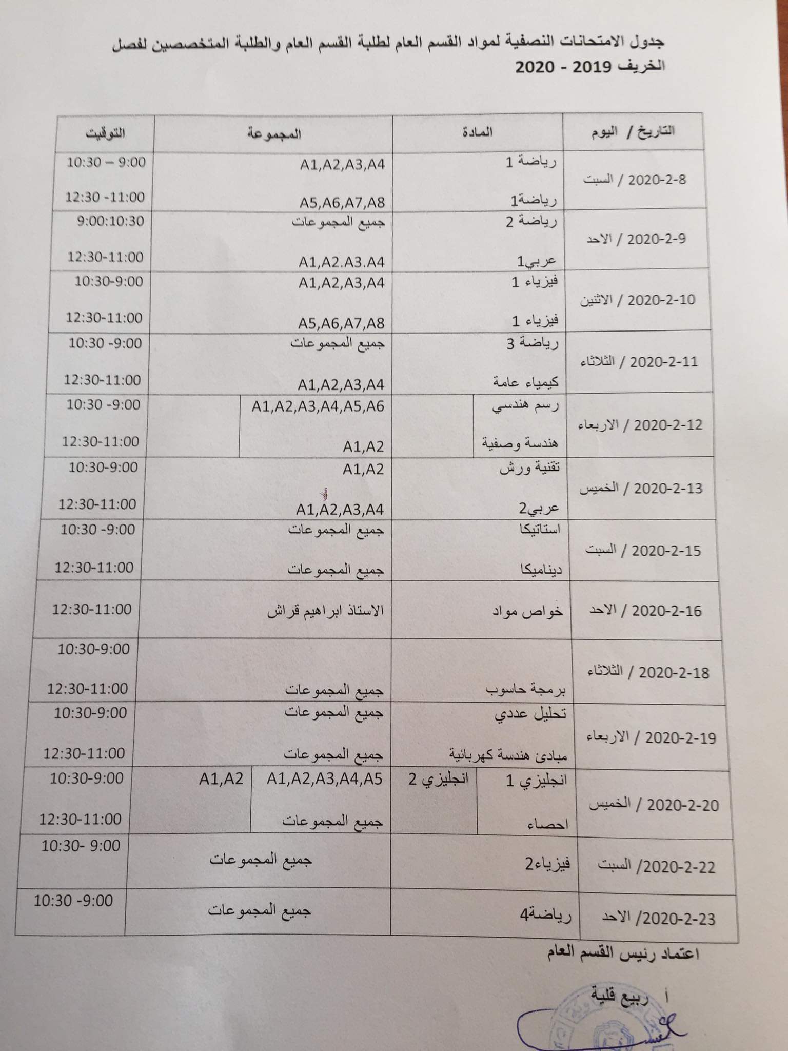 الجدول النهائي للفصل الدراسي خريف 2019/2020
