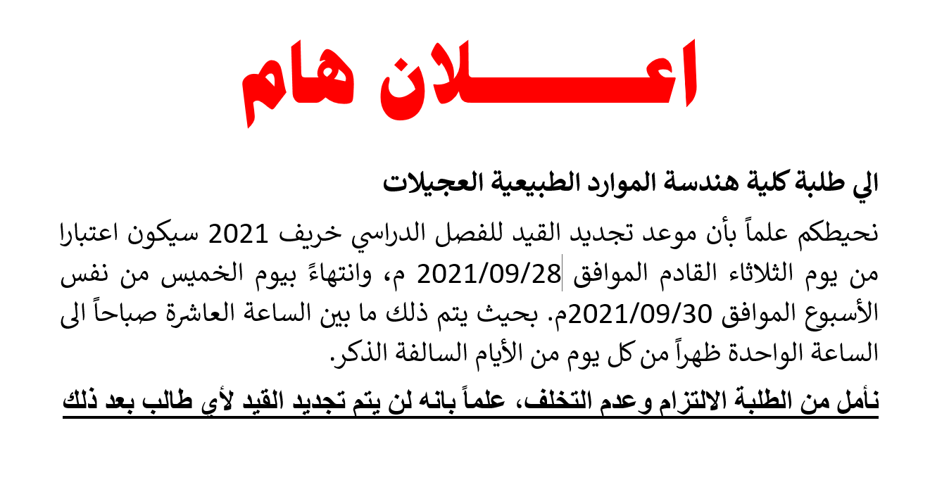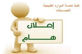 تعلن كلية هندسة الموارد الطبيعية العجيلات عن البدء في تجديد القيد للفصل الدراسي الخريف 2019/2020 لجميع الطلبة ابتداءاً من يوم الاثنين القادم 18/11/2019 الي غاية نهاية دوام يوم الخميس 21/11/2019 ولن يتم تجديد القيد لآي طالب بعد هذا الموعد