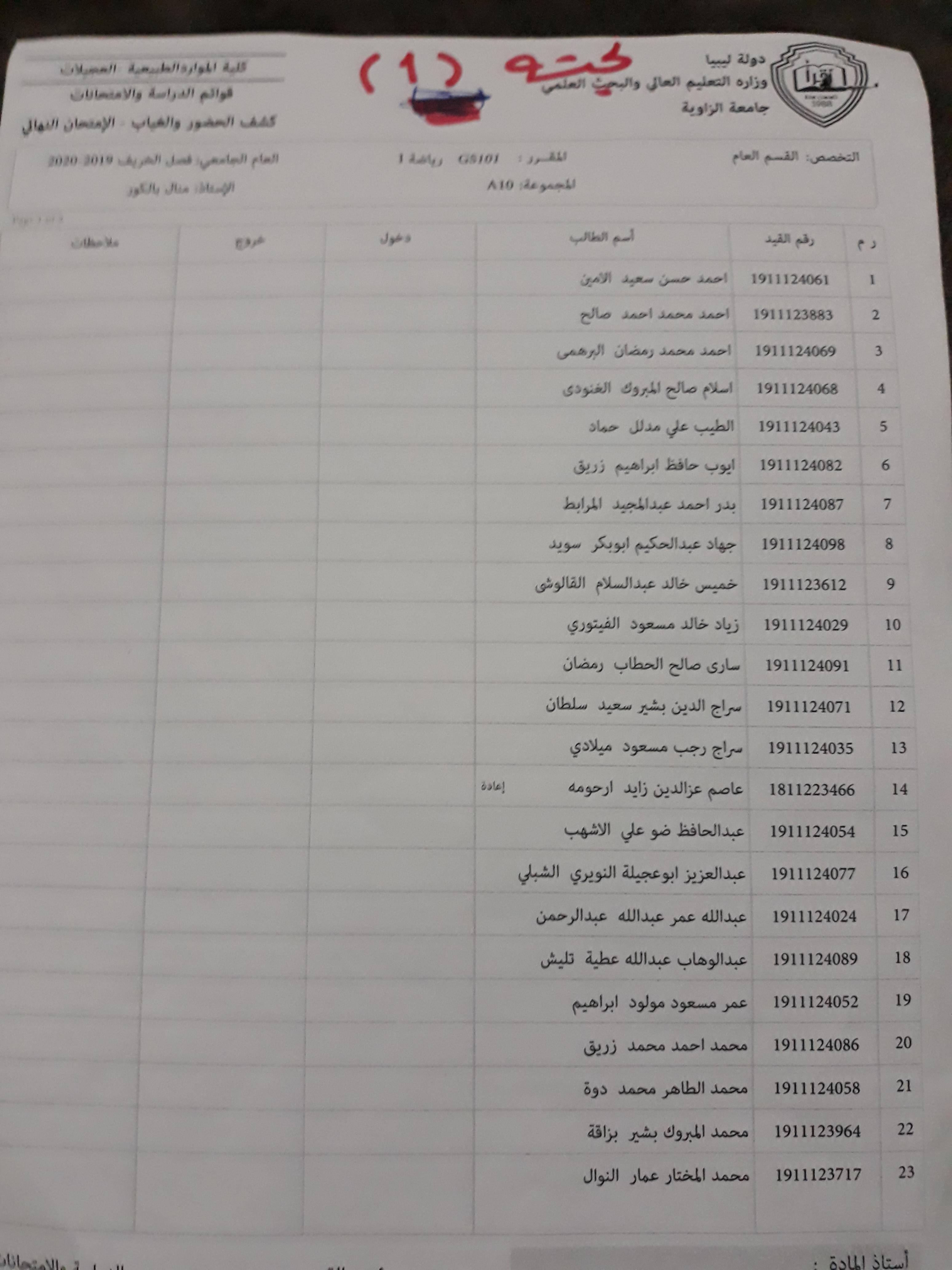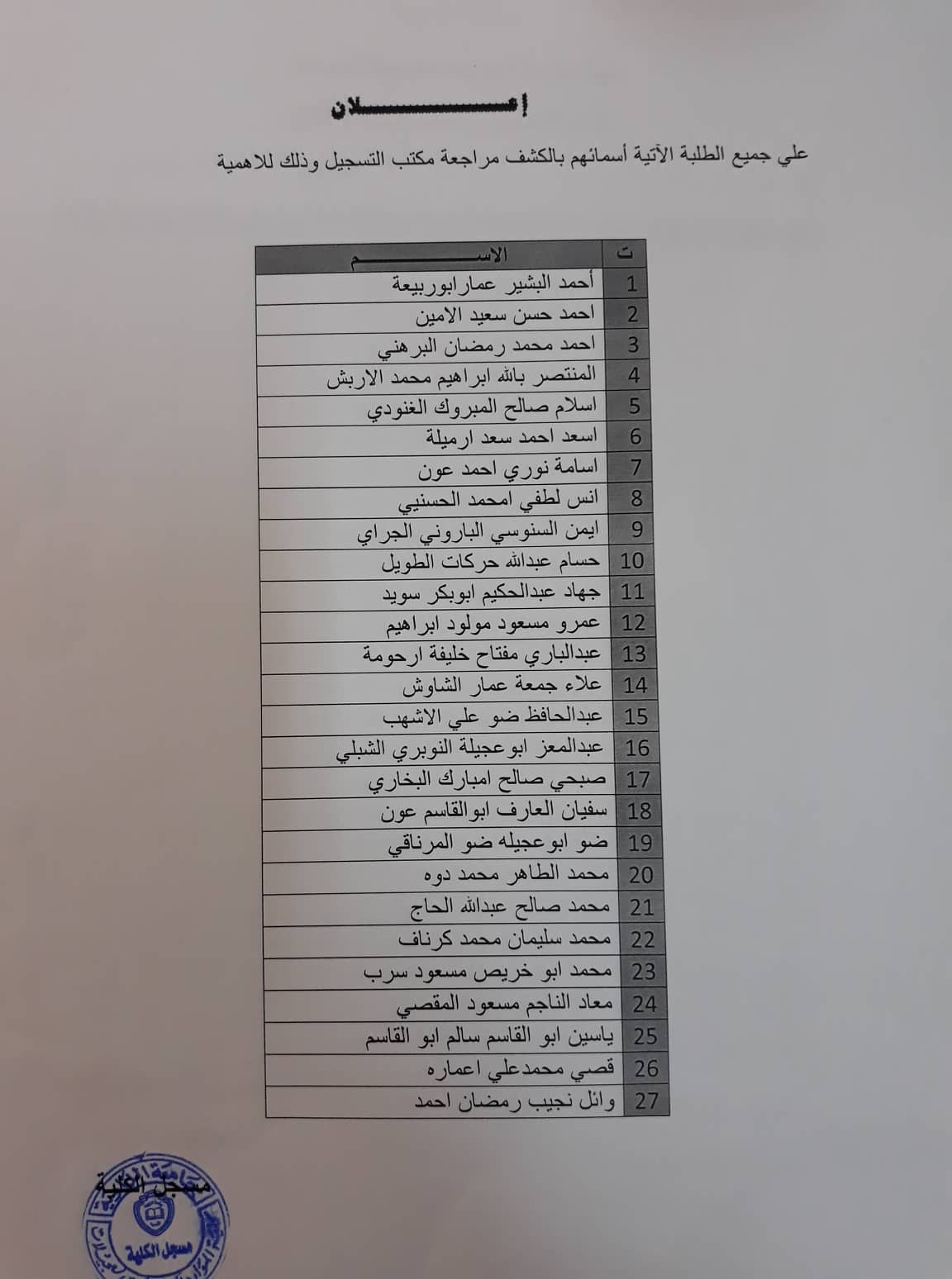 الطلبة الاتية اسمائهم مراجعة القسم العام في اقرب وقت لاستلام ورقة تنزيل موادهم ومن يتخلف يتحمل المسؤلية