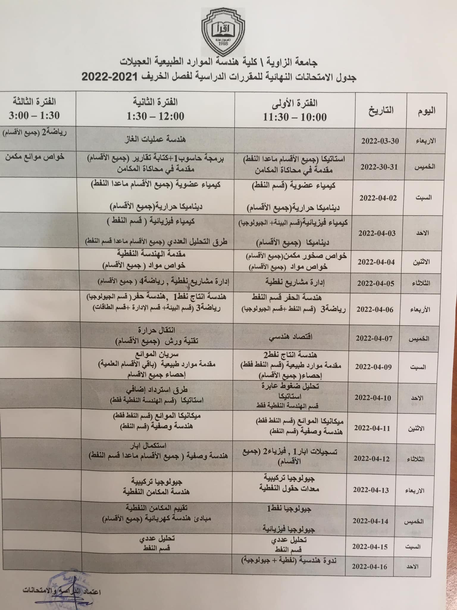 سيكون امتحان مادة جيولوجيا نفط يوم الاربعاء الموافق 22/2/2022 الساعة 9.00