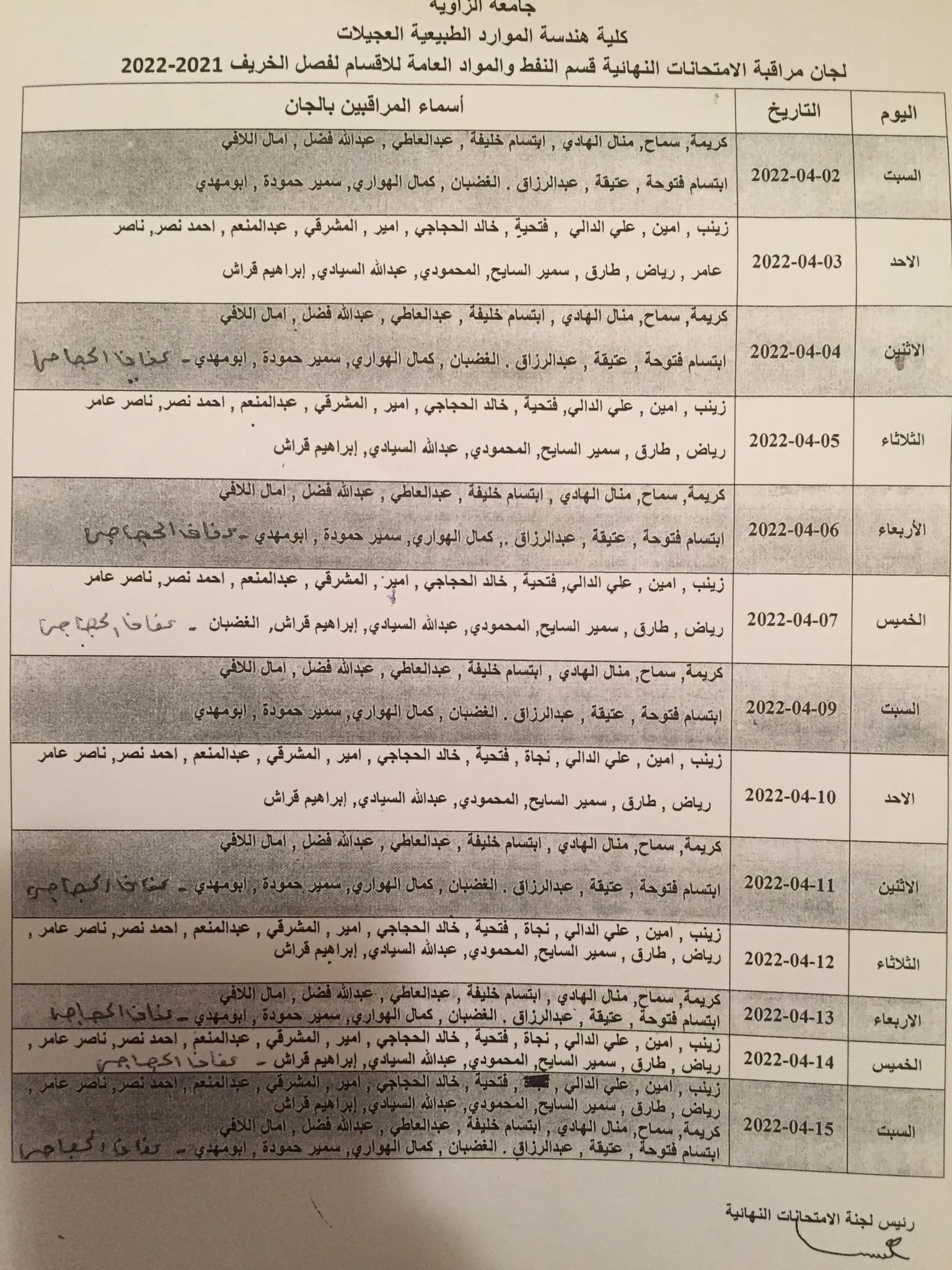 جدول توزيع اعضاء هيئة التدريس علي ايام لجان المراقبة ارجو من الجميع الالتزام بالحضور في التوقيت المناسب وعدم التأخير
