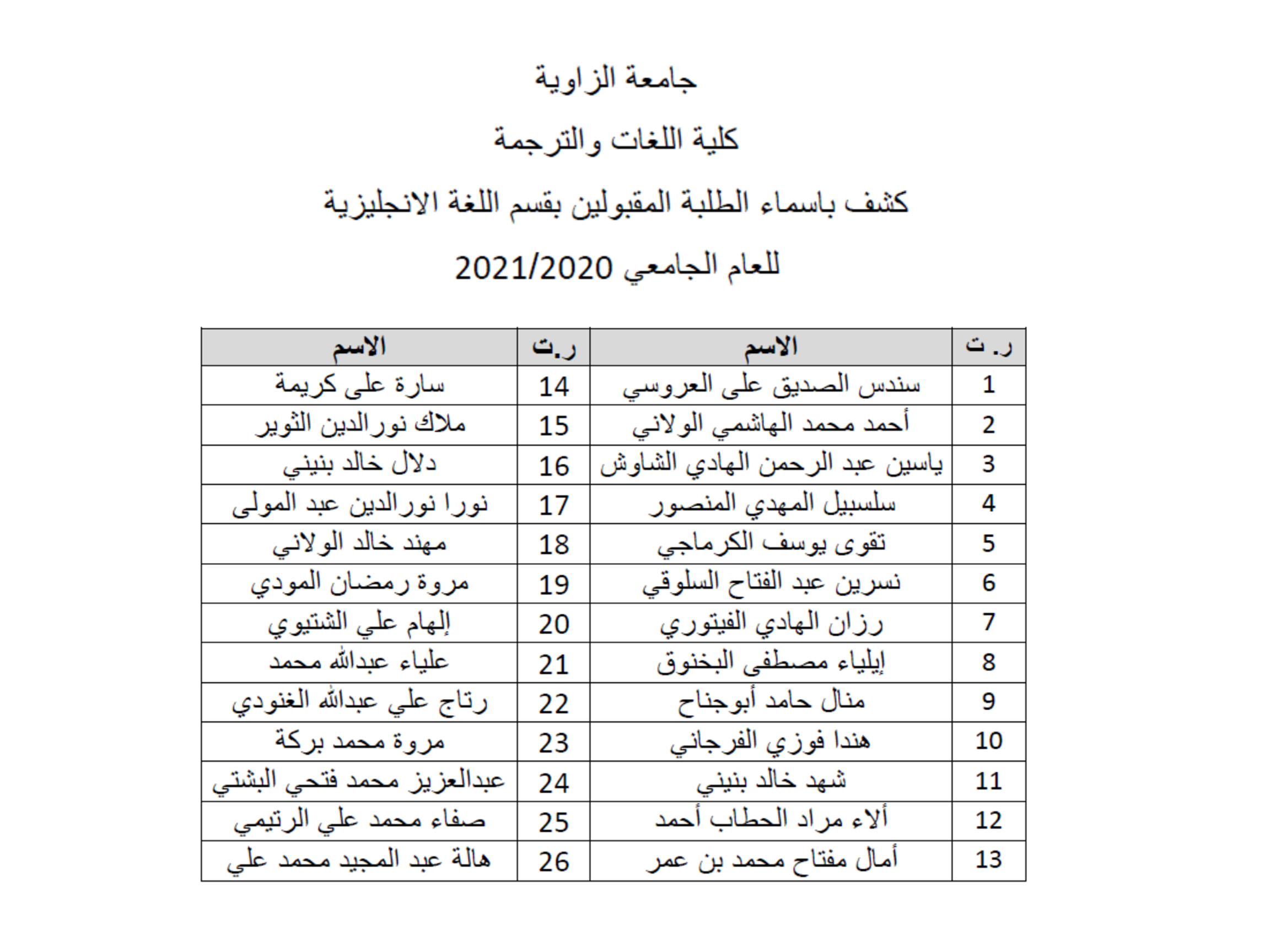 الطلبة المقبولون في المفاضلة بقسم اللغة الإنجليزية للعام: 2020\2021