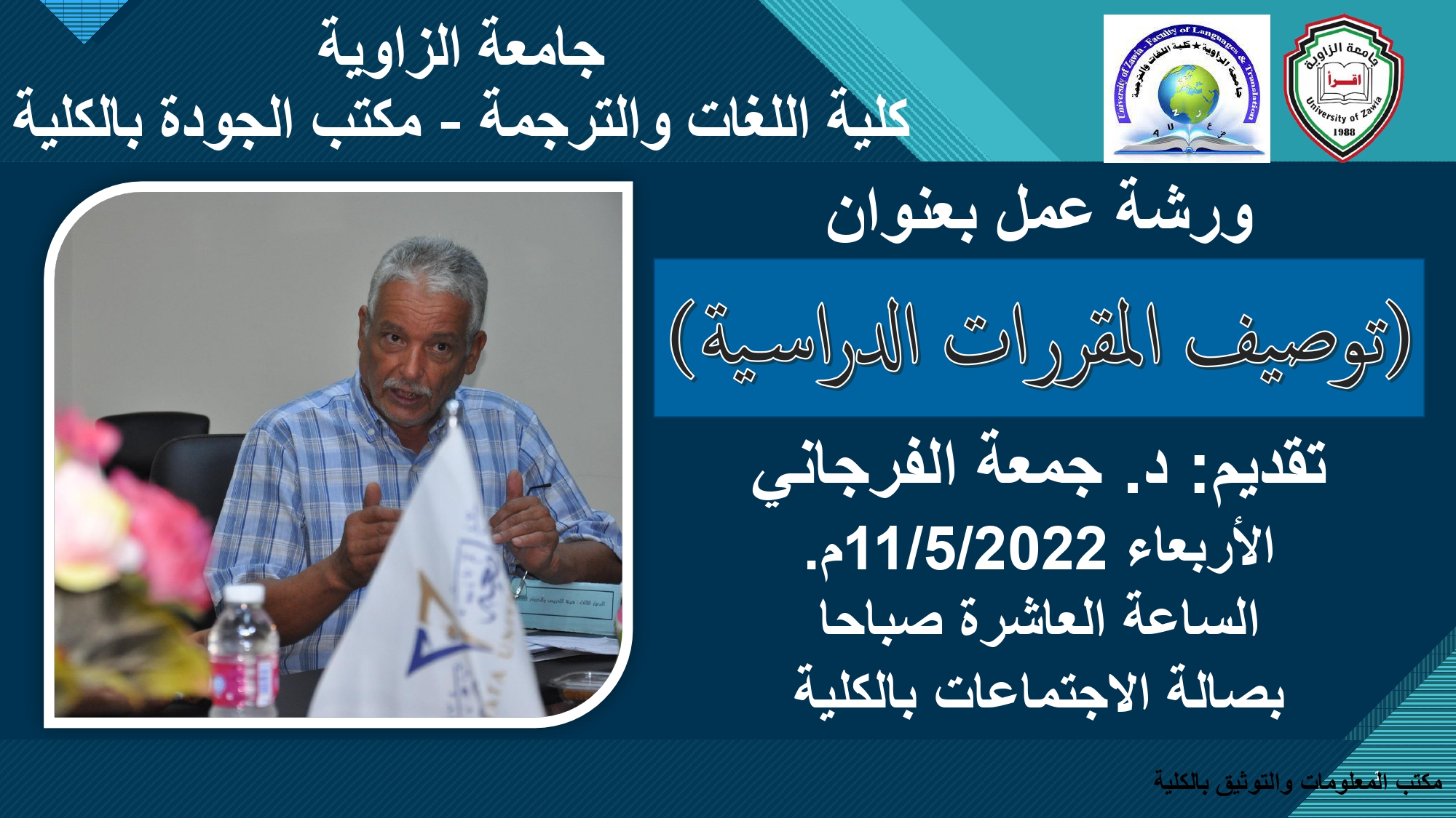 يعلن مكتب ضمان الجودة و تقييم الأداء بكلية اللغات والترجمةعن إقامة ورشة عمل بعنوان ( توصيف المقررات و البرامج الدراسية ) يُلقيها أ.د.جمعة الفرجاني، و ذلك يوم الأربعاء الموافق 11-5-2022م على تمام الساعة 10صباحًا بصالة الاجتماعات بالكلية.