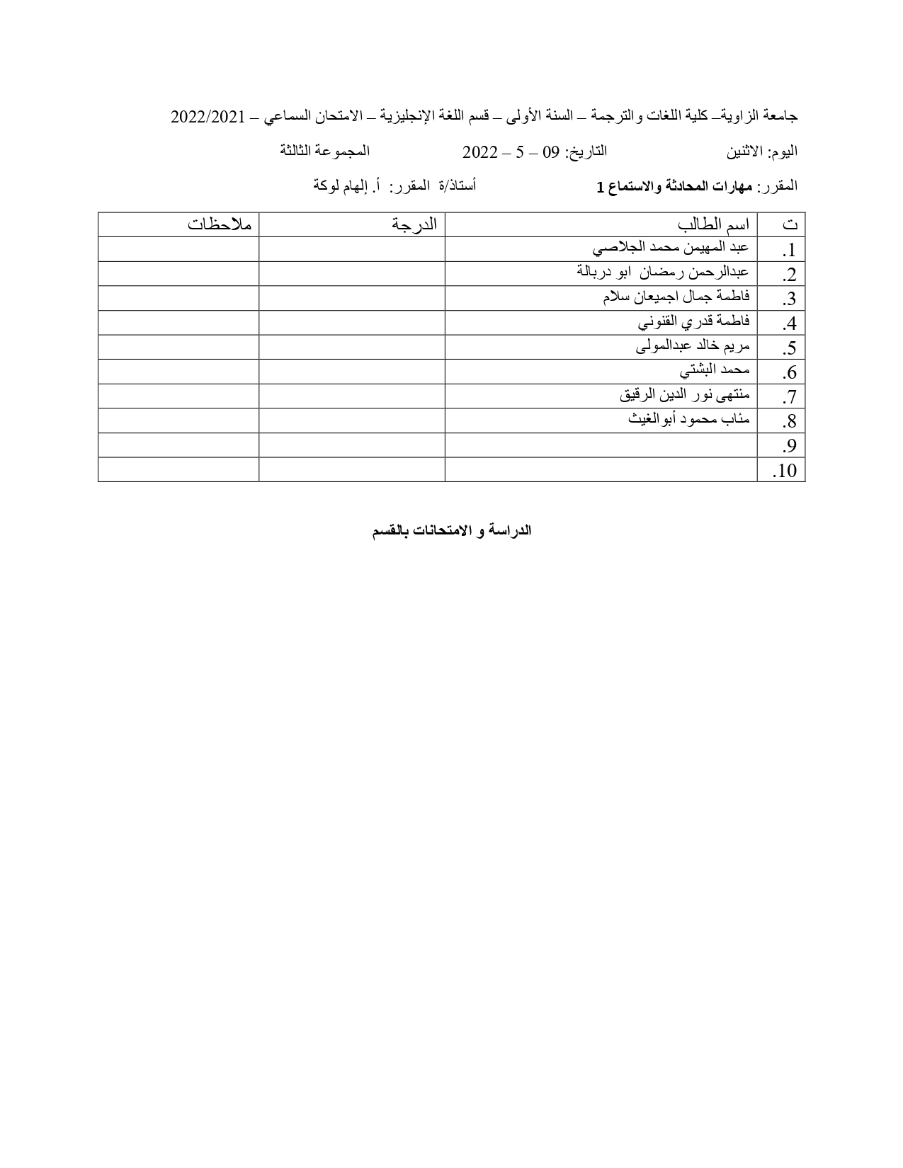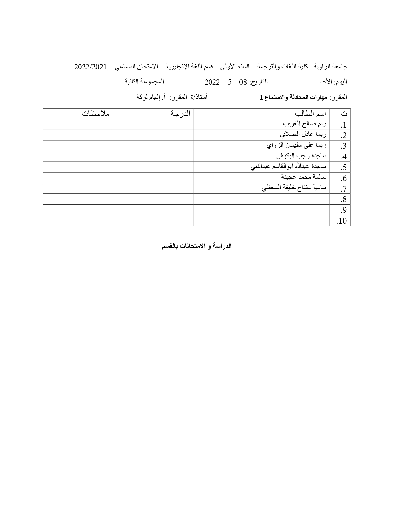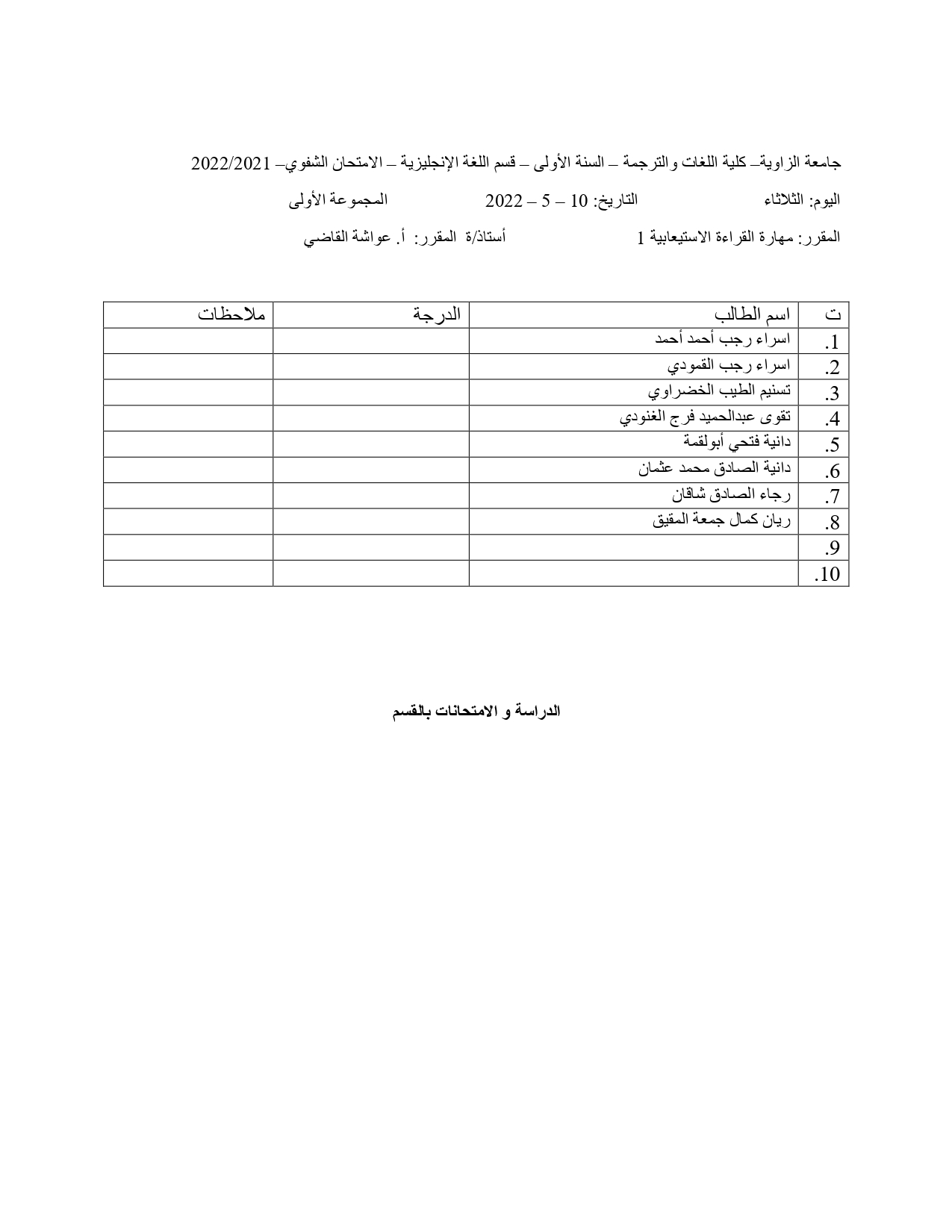 1. على جميع طلبة السنة المقيدين بقسم اللغة الإنجليزية و الذين لم ترد أسماؤهم في قوائم الأسماء التي أُعْلِنَ عنها مسبقاً، ضرورة مراجعة إدارة القسم يوم السبت القادم الموافق 7-5-2022م. 2. على جميع طلبة التكميلي للسنوات (الأولى و الثانية ) الذين وردت أسماؤهم في مقررات تمت تصفيتها غير ملزمين بأداء الامتحانات بها. #مكتب الدراسة و الامتحانات بالكلية