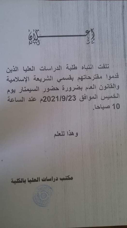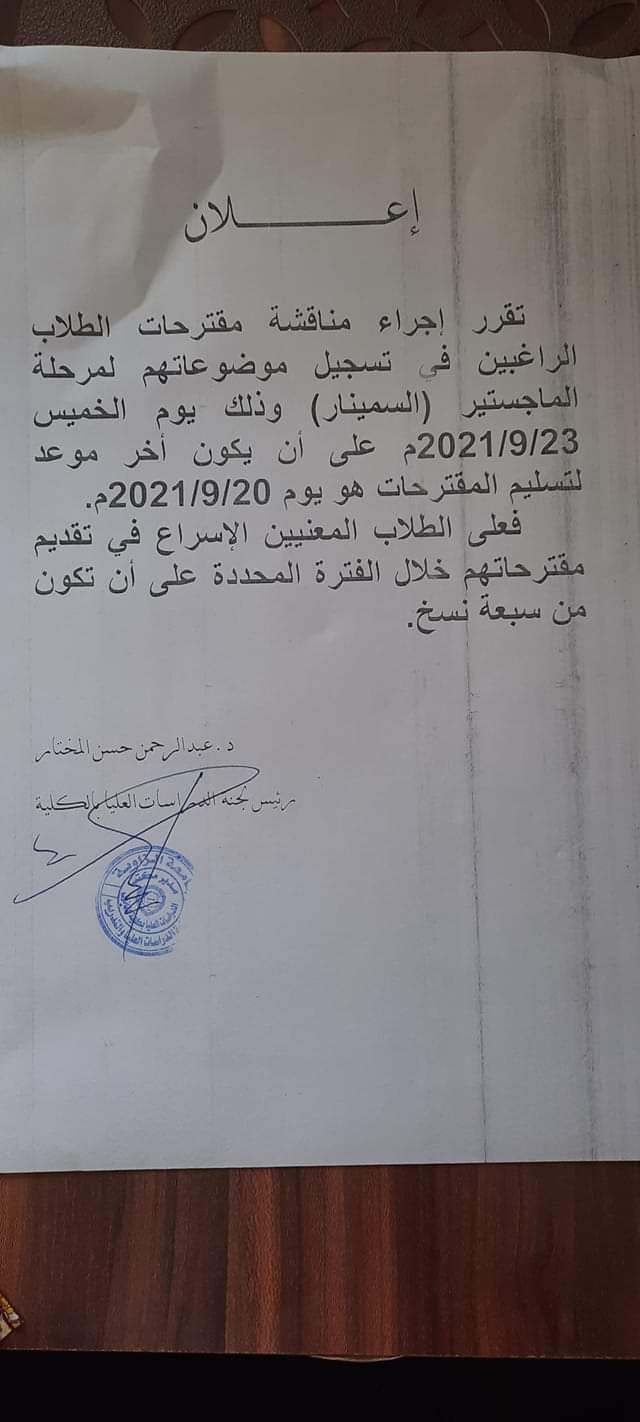 تقرر اجراء مناقشة مقترحات الطلاب الراغبين في تسجيل موضوعات لمرحلة الماجستير (السمينار)، وذلك يوم الخميس الموافق: 2021/9/23 على أن يكون آخر موعد لتسليم المقترحات هو يوم 2021/9/20.