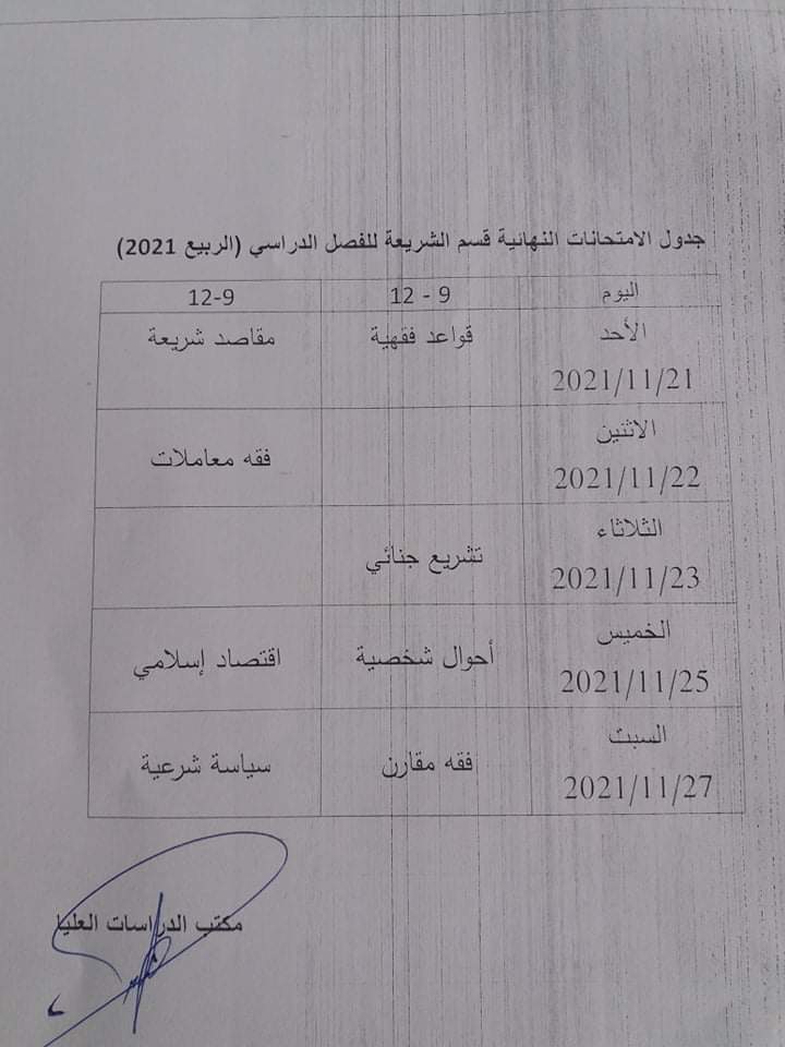 تم تعديل الجدول الدراسي والذي سيبدأ العمل به من يوم الأحد القادم 25 أبريل ..وسيكون تقسيم الطلبة في مجموعات سيتم الإعلان عنها في لوحة الإعلانات يوم الخميس 22 ابريل ... وعليه لم يتم تحديد موعد الإمتحانات النصفية والتي سيتم تحديدها لاحقا هذا للعلم....نتمنى للجميع التوفيق. مكتب الدراسة والإمتحانات