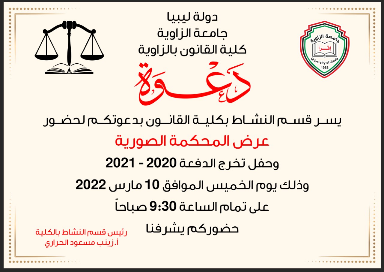 يعلن قسم النشاط بكلية القانون جامعة الزاوية عن اقامة المحكمة الصورية و إقامة حفل تخريج الدفعة 2021/2020