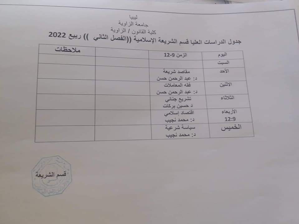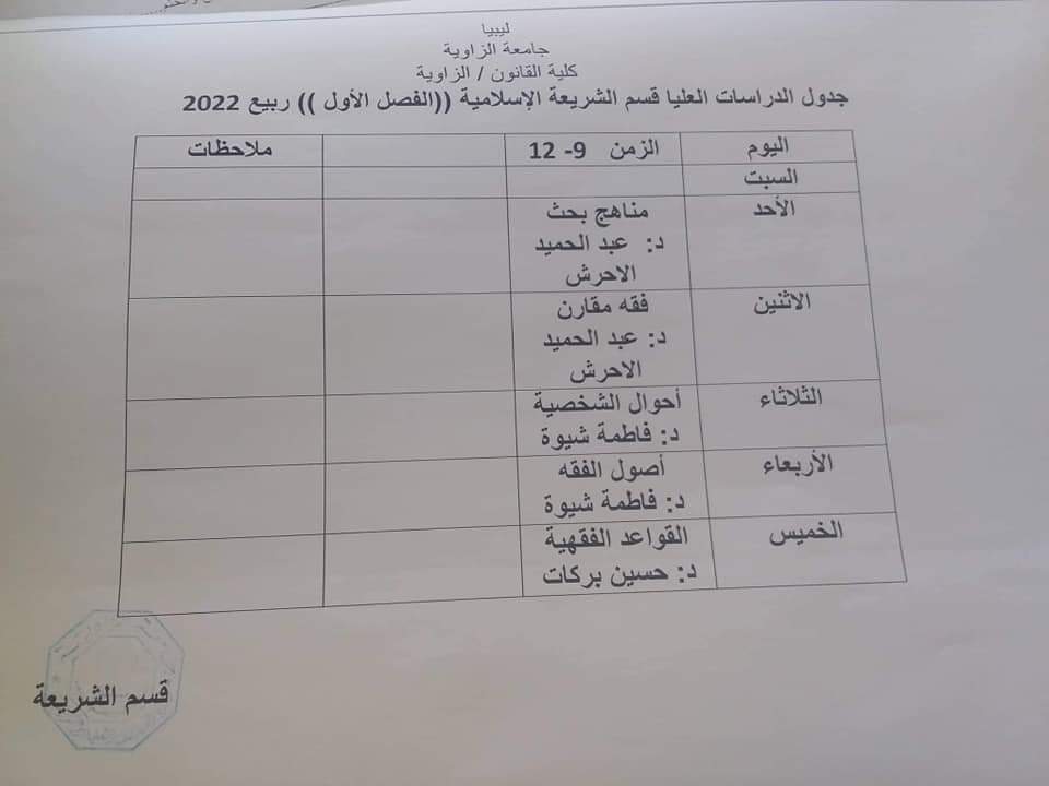 السادة أعضاء قسم الشريعة الإسلامية أنتم مدعوون لحضور الاجتماع الطارىء ، الذي سيعقد يوم الإثنين الموافق: 26 أبريل عند الساعة العاشرة تماما ، ومن يتخلف يتحمل مسؤولية ذلك.