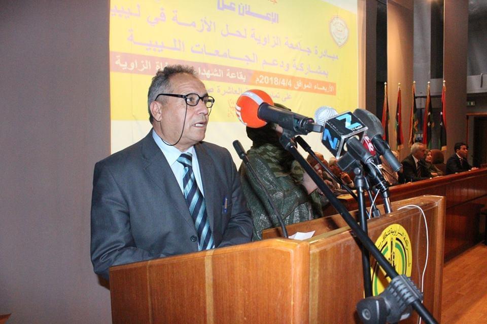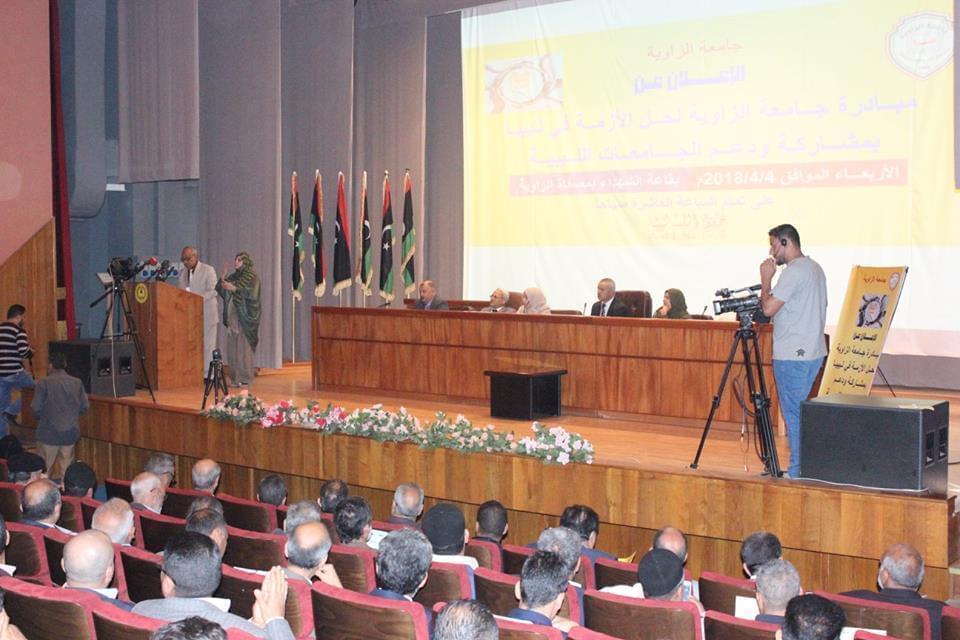 انطلاقاً من الدور الذي تضطلع به المؤسسات الأكاديمية بعدّها بيوتاً للخبرة ، قادرة على الدرس والتحليل ،واقتراح الحلول العلمية للمشاكل والأزمات التي تواجه الدولة وتهدد وجودها، فإن جامعة الزاوية تقدمت بمبادرة وطنية إلى الجامعات الليبية في اجتماعها بطرابلس ، بمقرّ إدارة الامتحانات يوم الاثنين الموافق 12 مارس 2018 م ،علّها تكون بلسماً شافياً لمعالجة الوضع الراهن وفق أسس علمية ،غلّبت فيها مصلحة الوطن، نائية عن المؤثّرات والأيديولوجيات وسياسات الترضية والمُحاصصة ، التي عمّقت الخلاف بين أبناء الوطن.