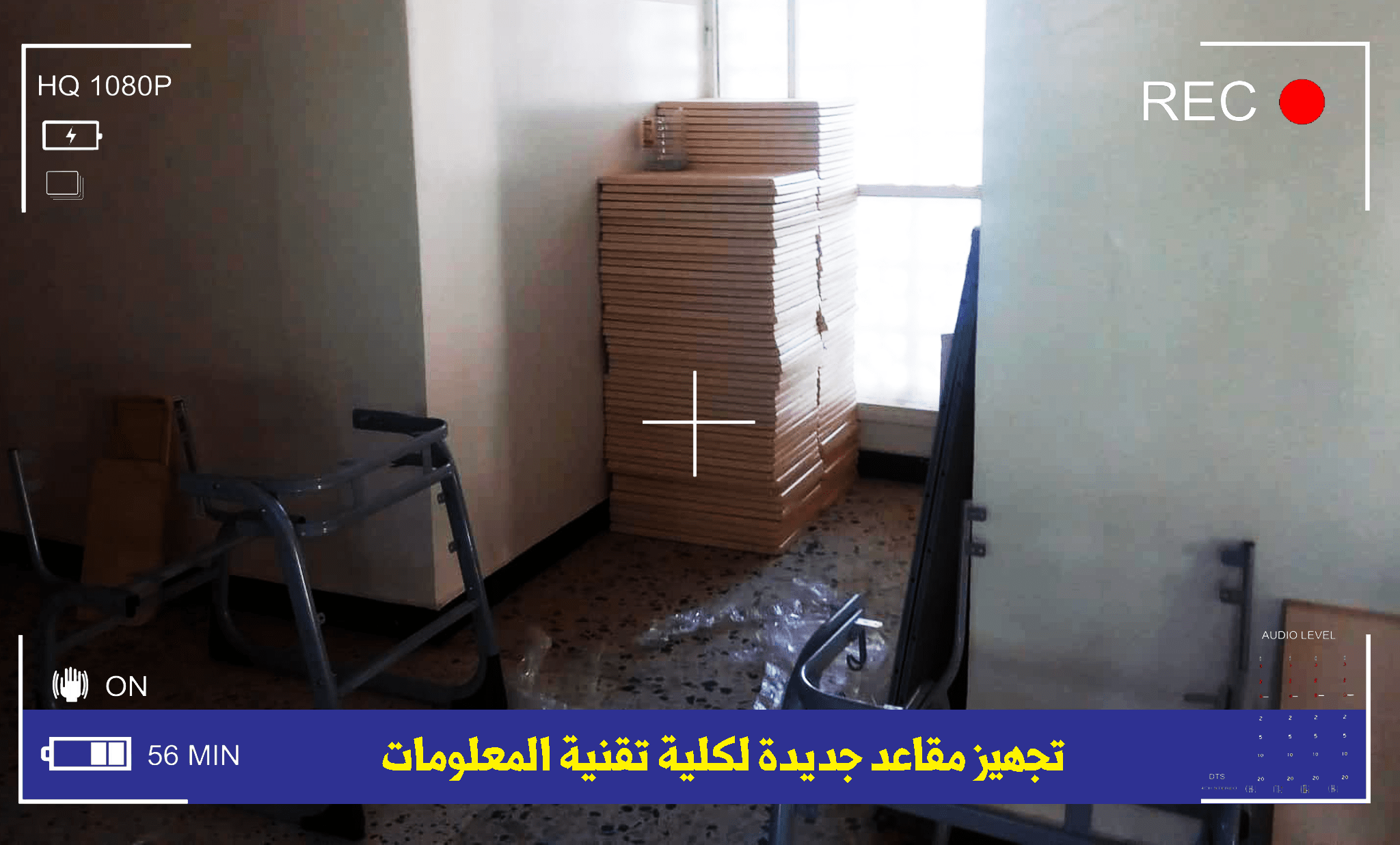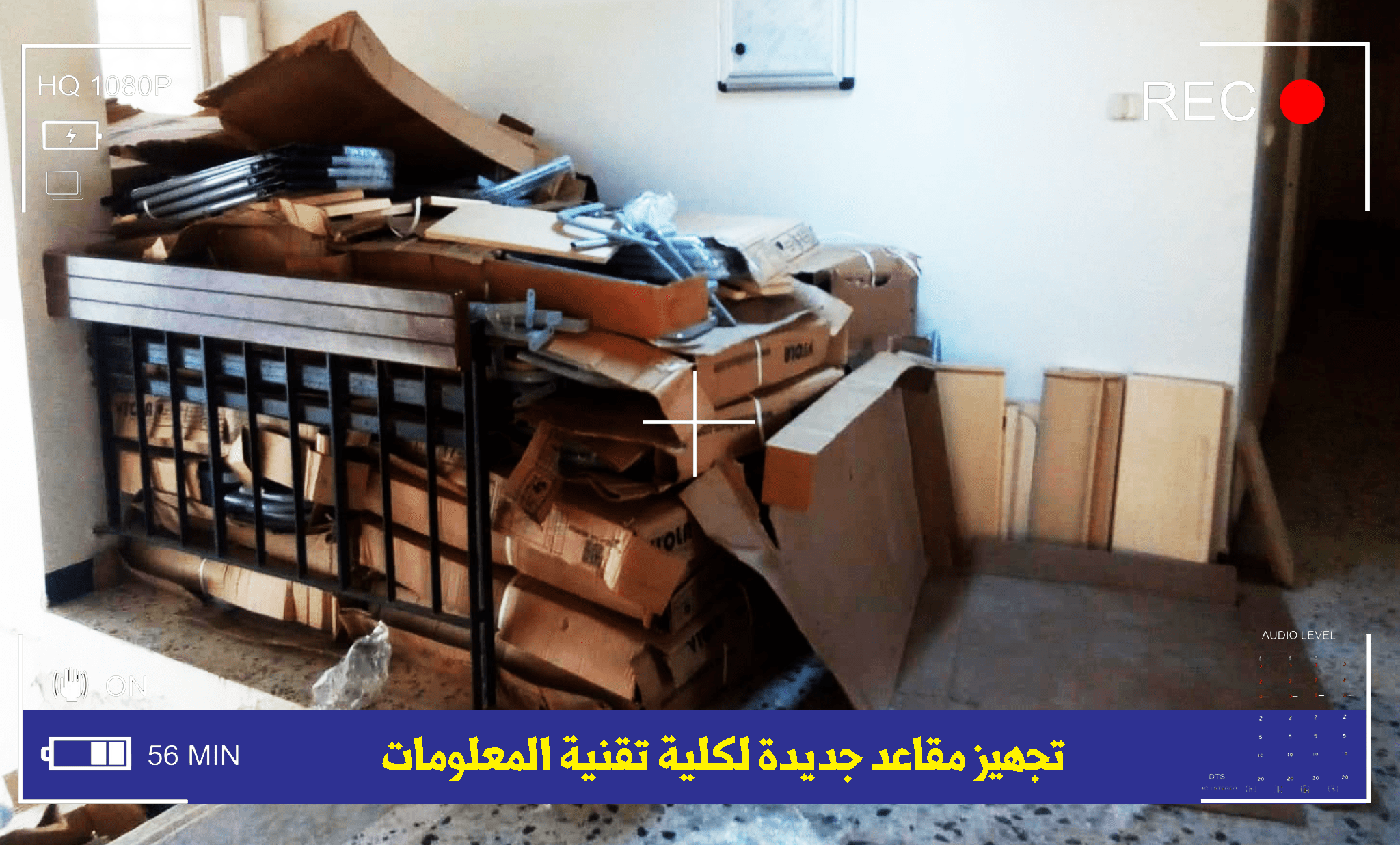 في اطار المساعي المبذولة من إدارة الكلية وإدارة الجامعة لتوفير المستلزمات اللازمة لإكمال العملية التعليمية، وتحت إشراف قسم الشؤون الادارية بالكلية تستمر فرق الصيانة التابعة للجامعة في تجهيز عدد 100 مقعد دراسي تم تخصيصها لكلية تقنية المعلومات بالإضافة لعدد من السبورات وطاولات الحاسوب، هذا ومن ناحية أخرى قامت فرق الصيانة في المدة الماضية بصيانة الإنارة بالطابق الاداري لكلية تقنية المعلومات وذلك في اطار جهود إدارة الكلية لتوفير الوسائل التعليمية تحضيراً لما هو قادم من مواعيد دراسية.