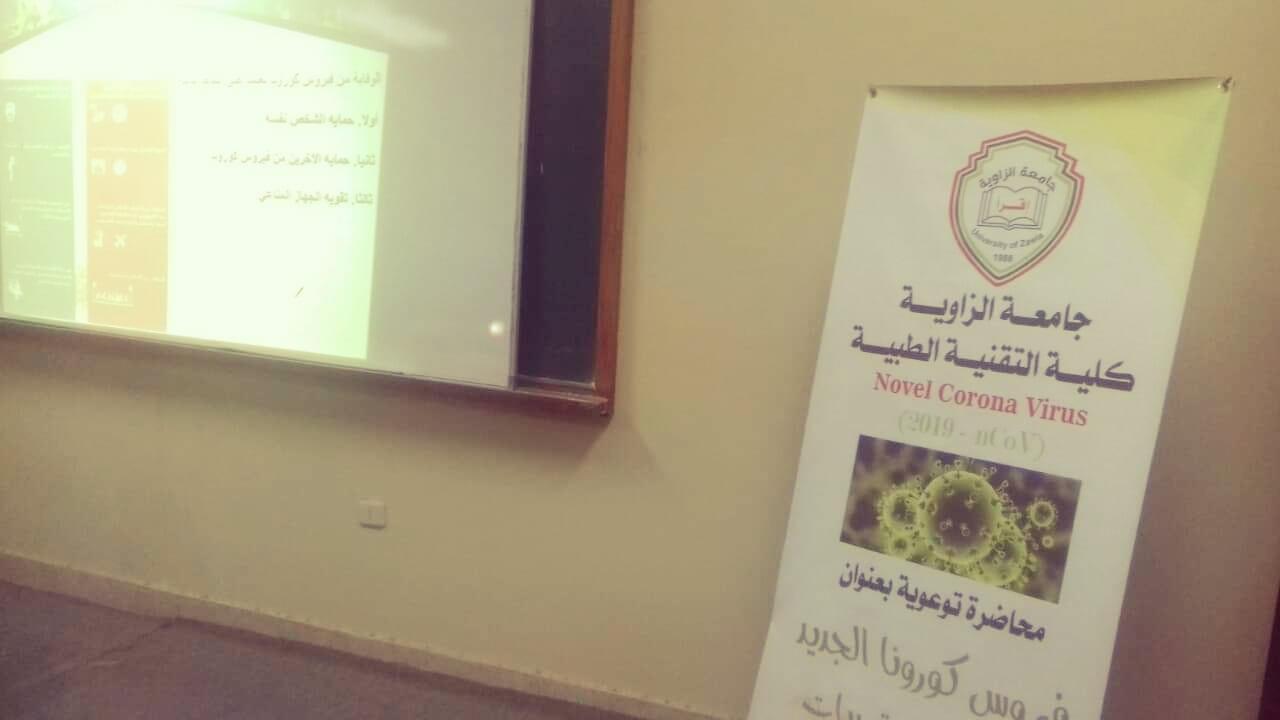 شهد اليوم السبت الموافق 2020/02/08م. انطلاقة البرنامج التوعوي حول فيروس كورونا المنتشر في عدد من دول العالم والذي تشرف عليه وتنظمه كلية التقنية الطبية جامعة الزاوية.. وكانت البداية صباح اليوم من المعهد المتوسط للمهن الميكانيكية بالزاوية بحضور عديد الأساتذة والإداريين والطلبة.