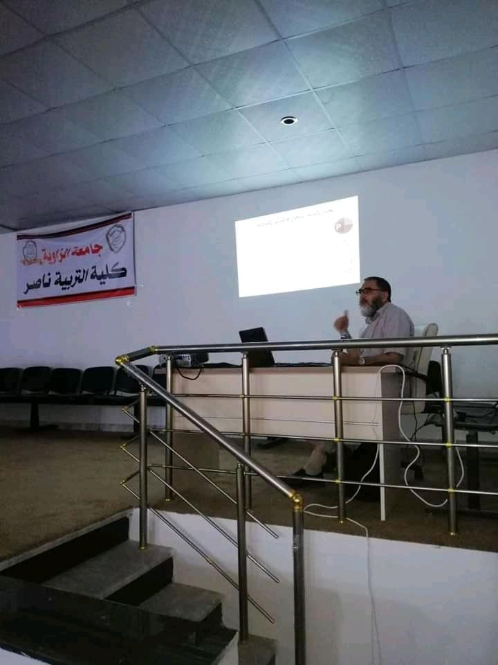 نظمت كلية التربية ناصر بجامعة الزاوية، يوم الأربعاء الموافق 17 يونيو 2020 عند الساعة العاشرة صباحاً، بمسرح الكلية ورشة عمل حول (التعليم والتعلم عن بعد)، قدمها الأستاذ دكتور حسن الشيباني عن مركز التعليم الالكتروني بالجامعة، وتناول خلالها العديد من المحاور، أهمها: