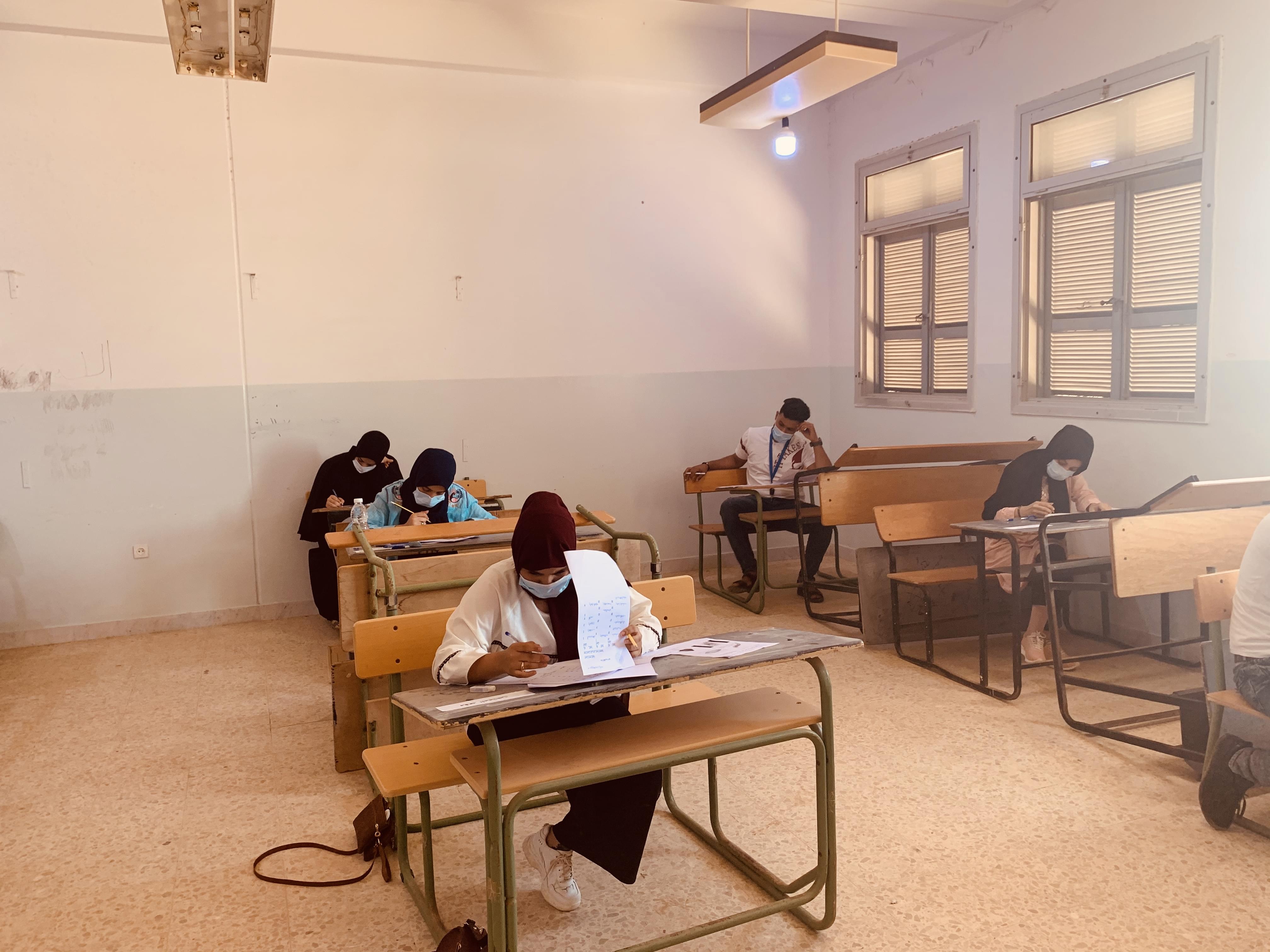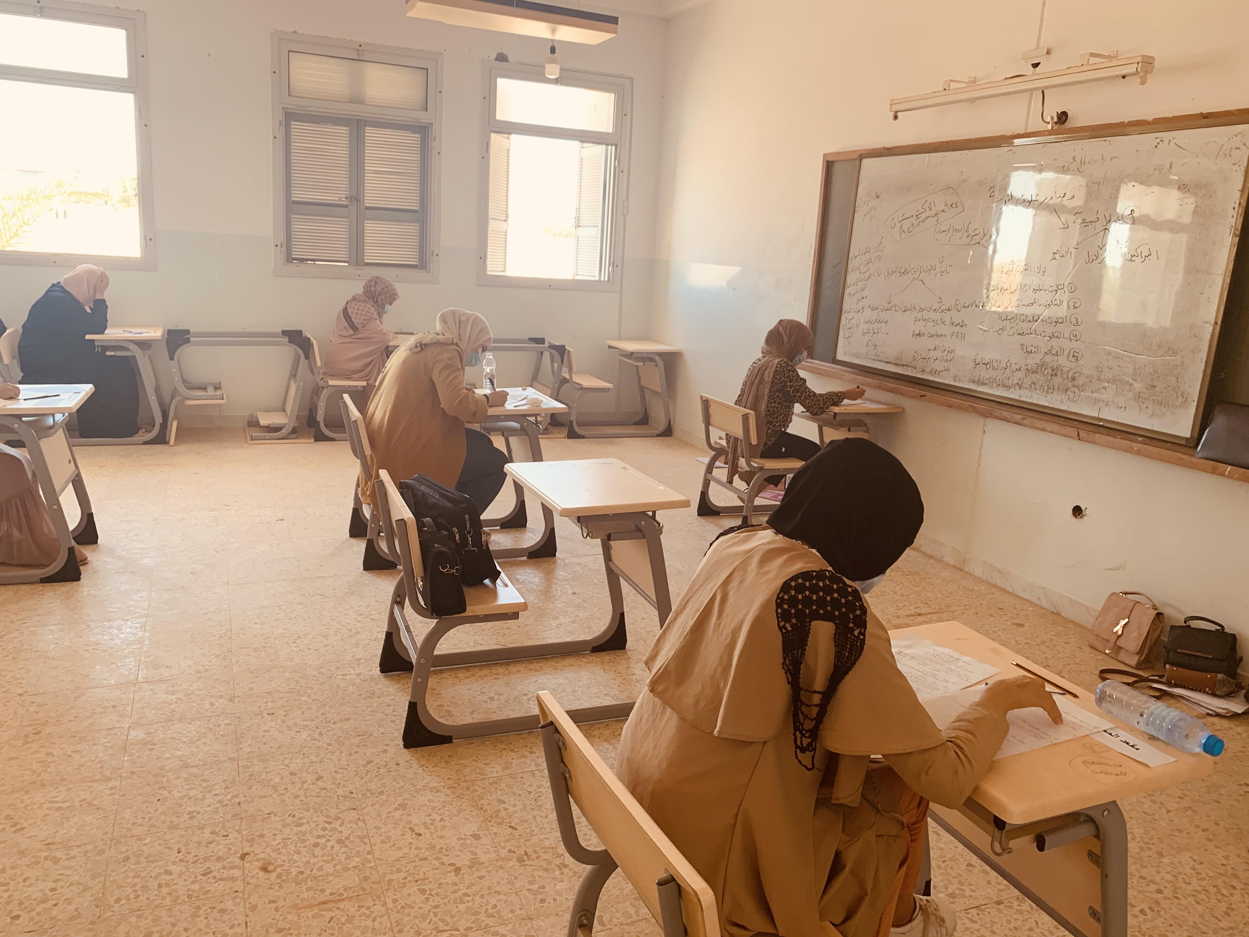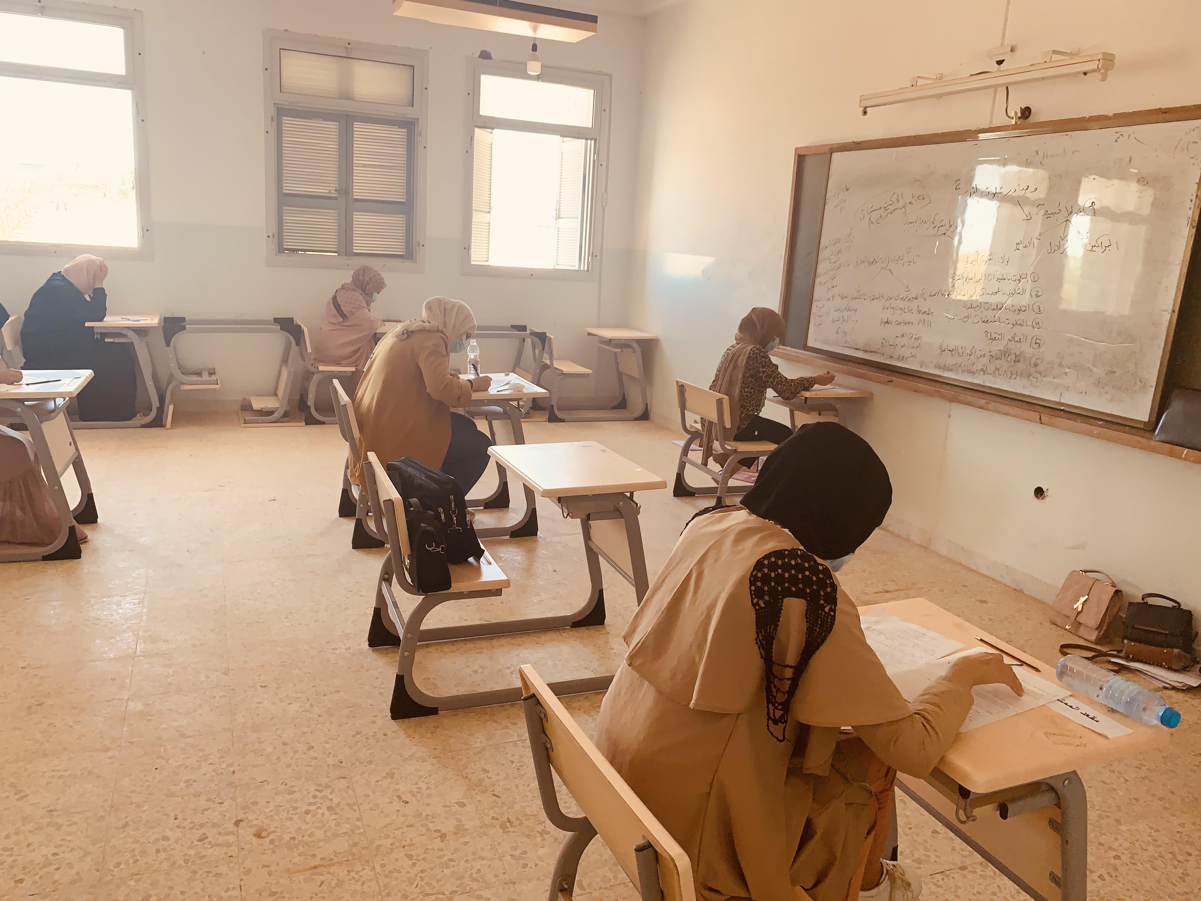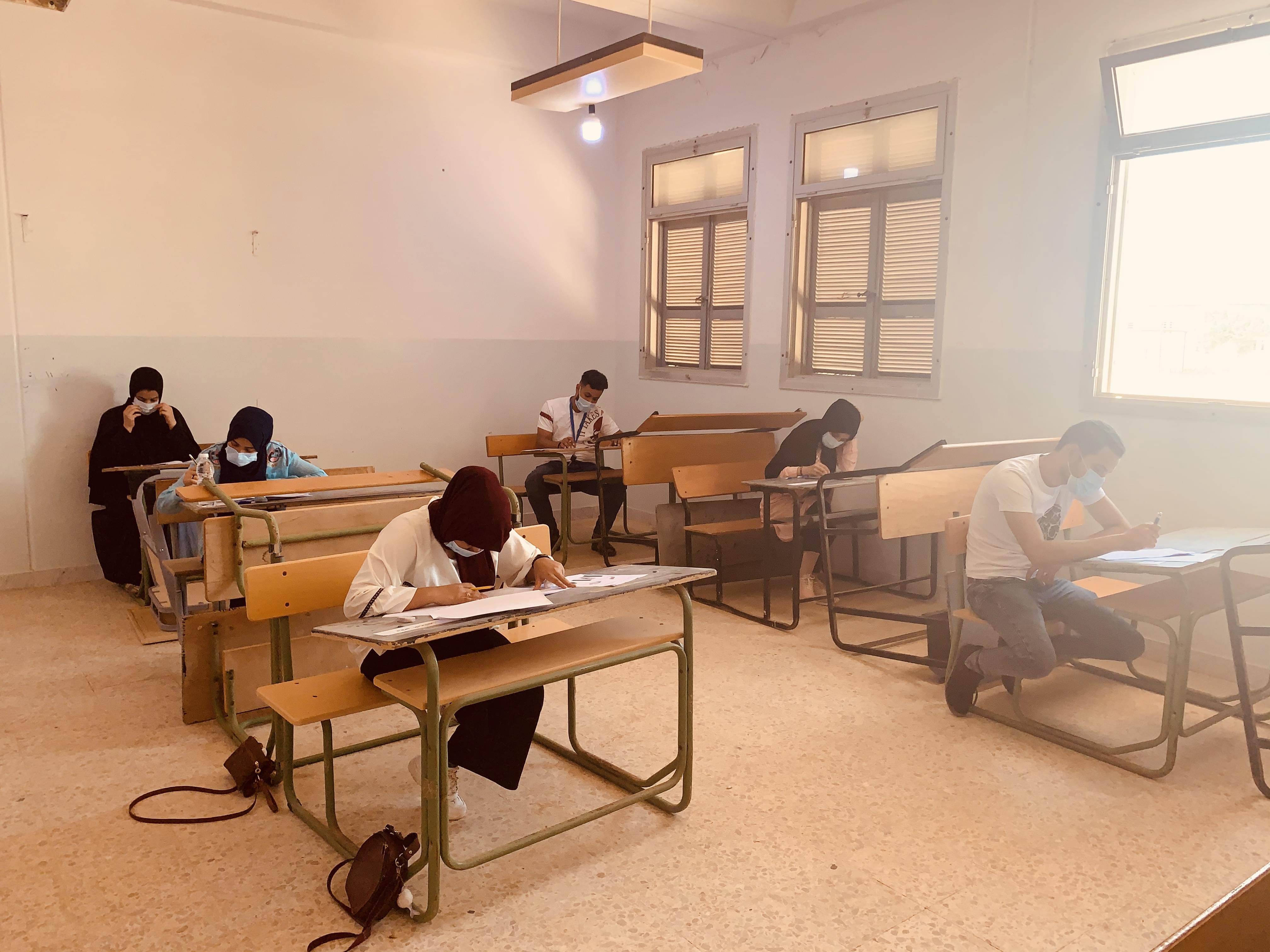 لليوم الثاني تجري الامتحانات النهائية بكلية العلوم بالعجيلات،  و بالتعاون مع لجنة مكافحة فيروس كورونا ببلدية الجديدة،  حيث يتم قياس درجة الحرارة و توزيع الكمامات و القفازات علي الطلبة قبل الدخول إلى قاعة الامتحان.