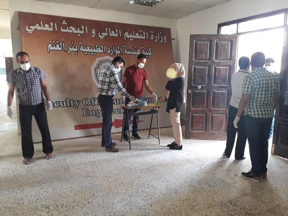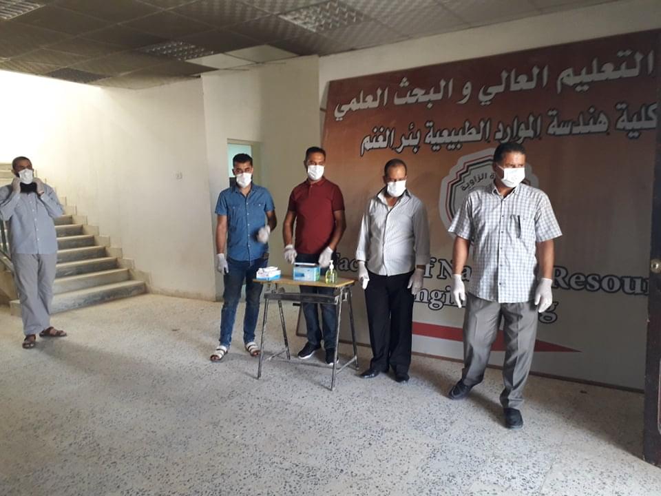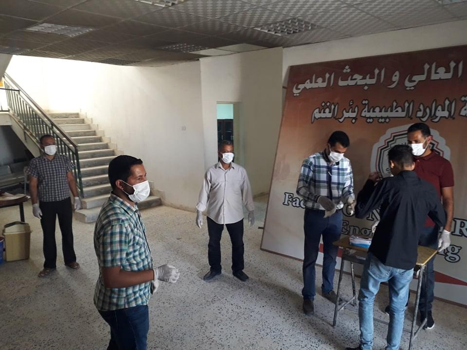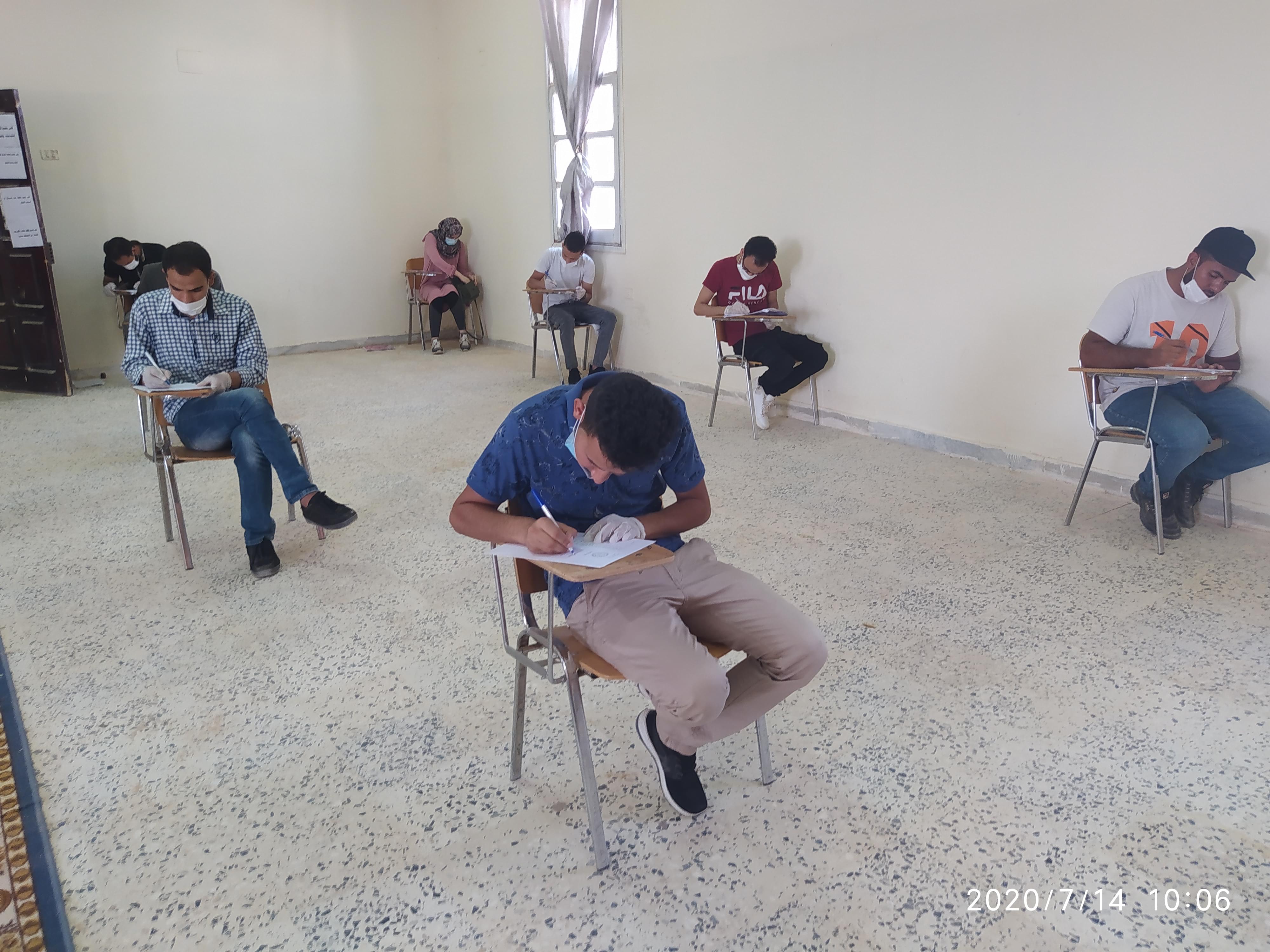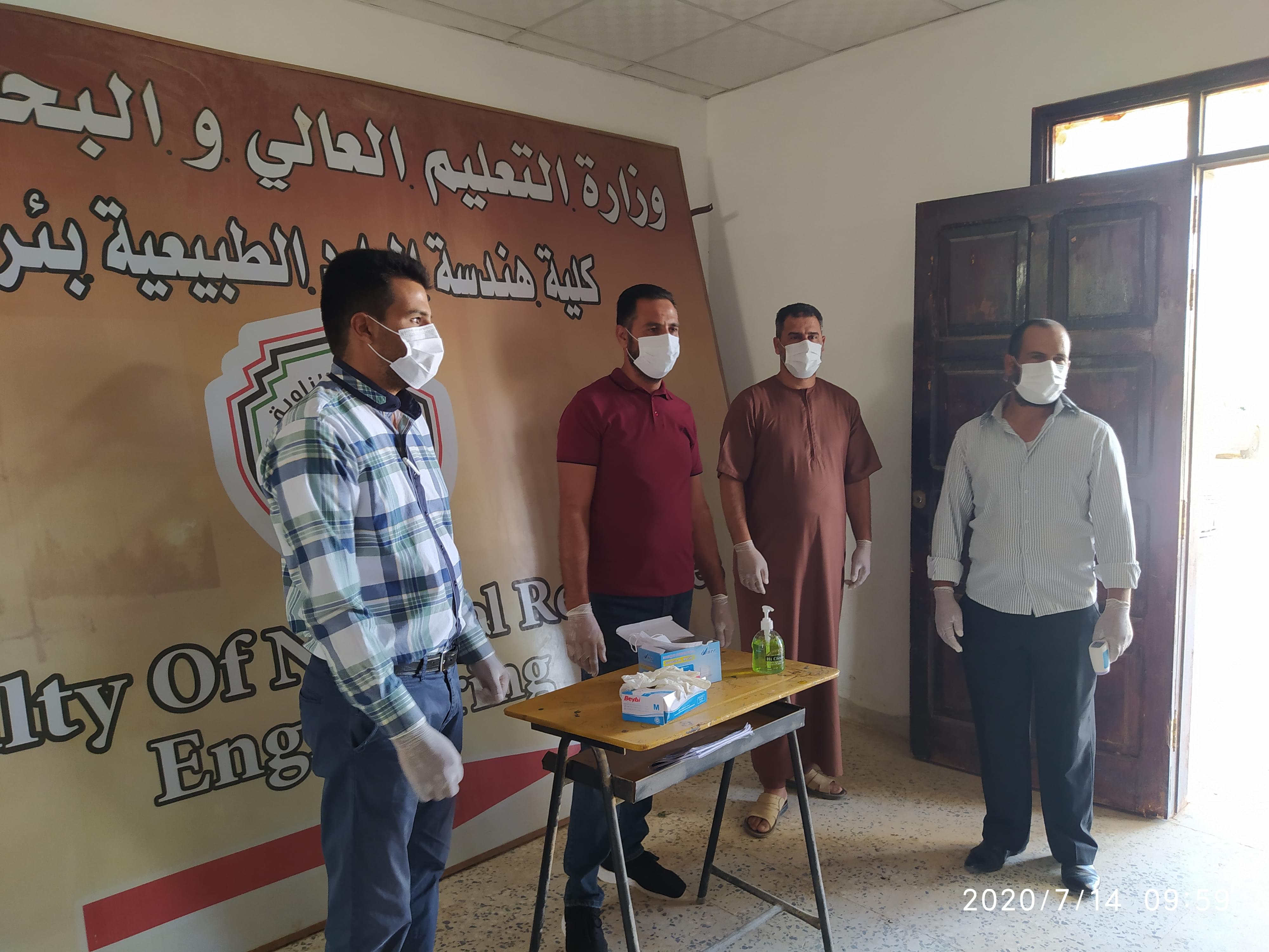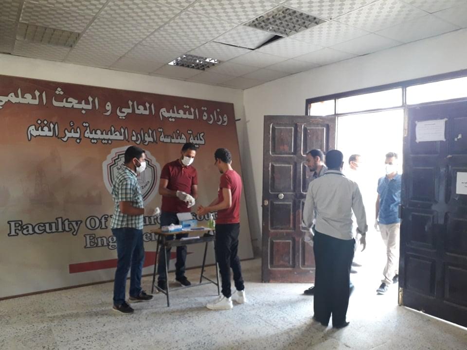 ورغم ان العدد قليل من طلبة وايضا الامتحانات المتبقية إلان أنه تم الاستعداد وبجدية وحرص شديد من قبل إدارة الكلية على سير الامتحانات وفق الشروط الصحية ووفق ما وصت به جمعية الهلال الاحمر الليبي من لبس كمامات وقفازات وترك مسافات آمنة بين الطلبة واستخدام المعقمات والمطهرات وغسل اليدين .