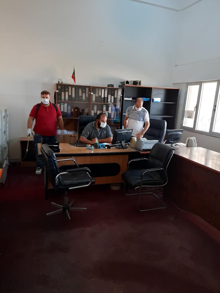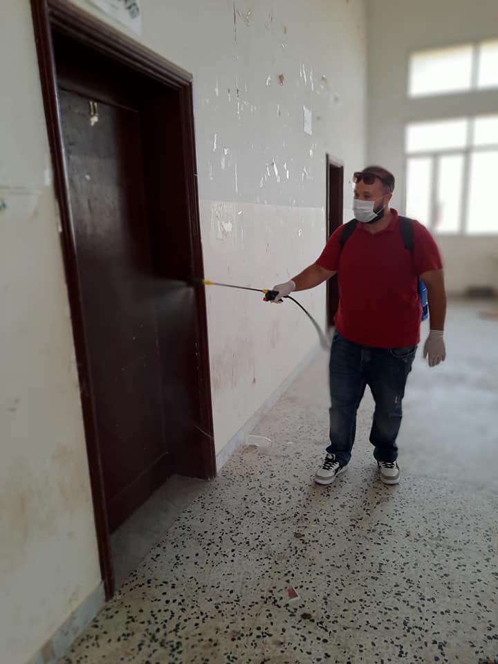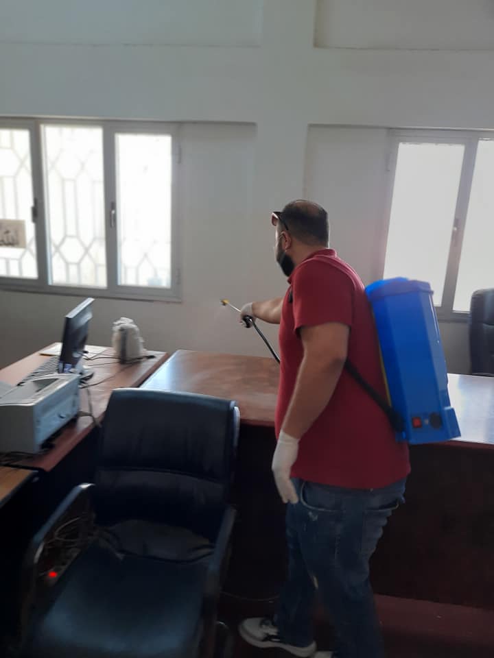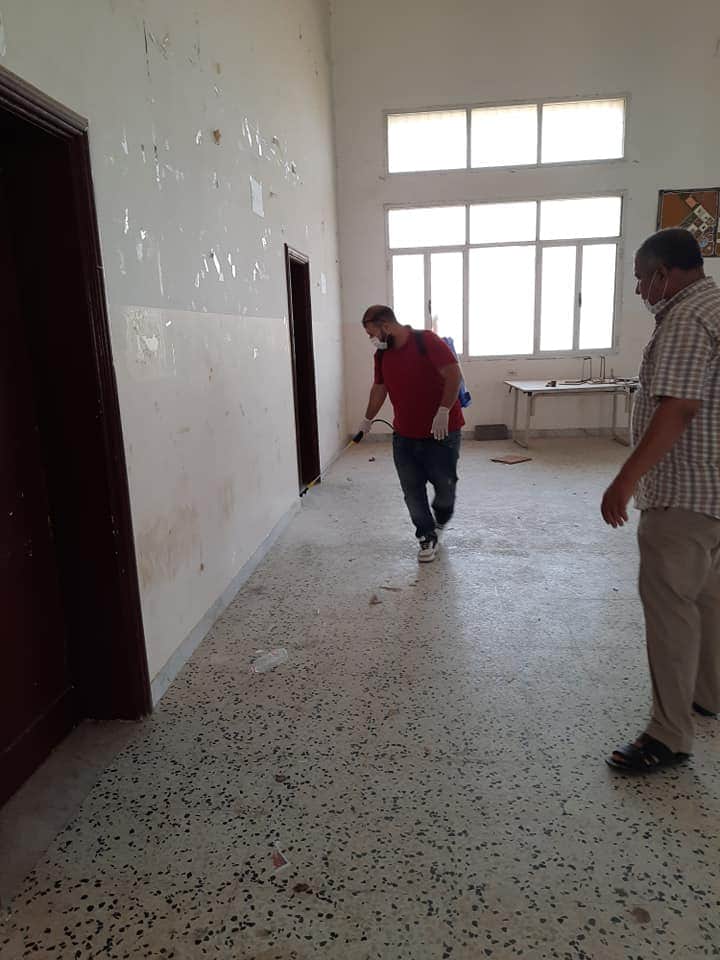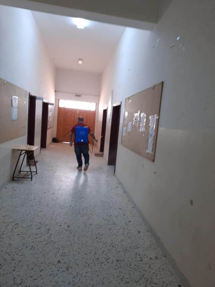 حرصا من ادارة الكلية لاستكمال الفصل الدراسي والمحافظة على صحة الطلبة والعاملين بالكلية قامت بالتواصل مع البلديات المجاورة لتوفير المستلزمات الوقائية لمكافحة جائحة فيروس كورونا نظرا لنقص توفرها بمخازن الجامعة . و بعد الحصول على كمية محدودة من مواد التعقيم والتطهير والقفازات والكمامات انطلقت يوم االسبت الموافق 18/07/2020 م الامتحانات العملية بالكلية. حيث تم توزيع الكمامات على الطلبة واعضاء هيئة التدريس و العاملين بالكلية . ولتعقيم مبنى الكلية قام العاملون بمكتب الشؤون الادارية والمالية بالكلية برش المكاتب والممرات وقاعات الامتحانات بمواد التعقيم والتطهير.