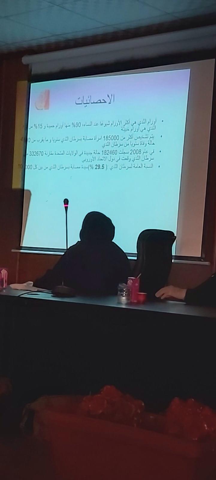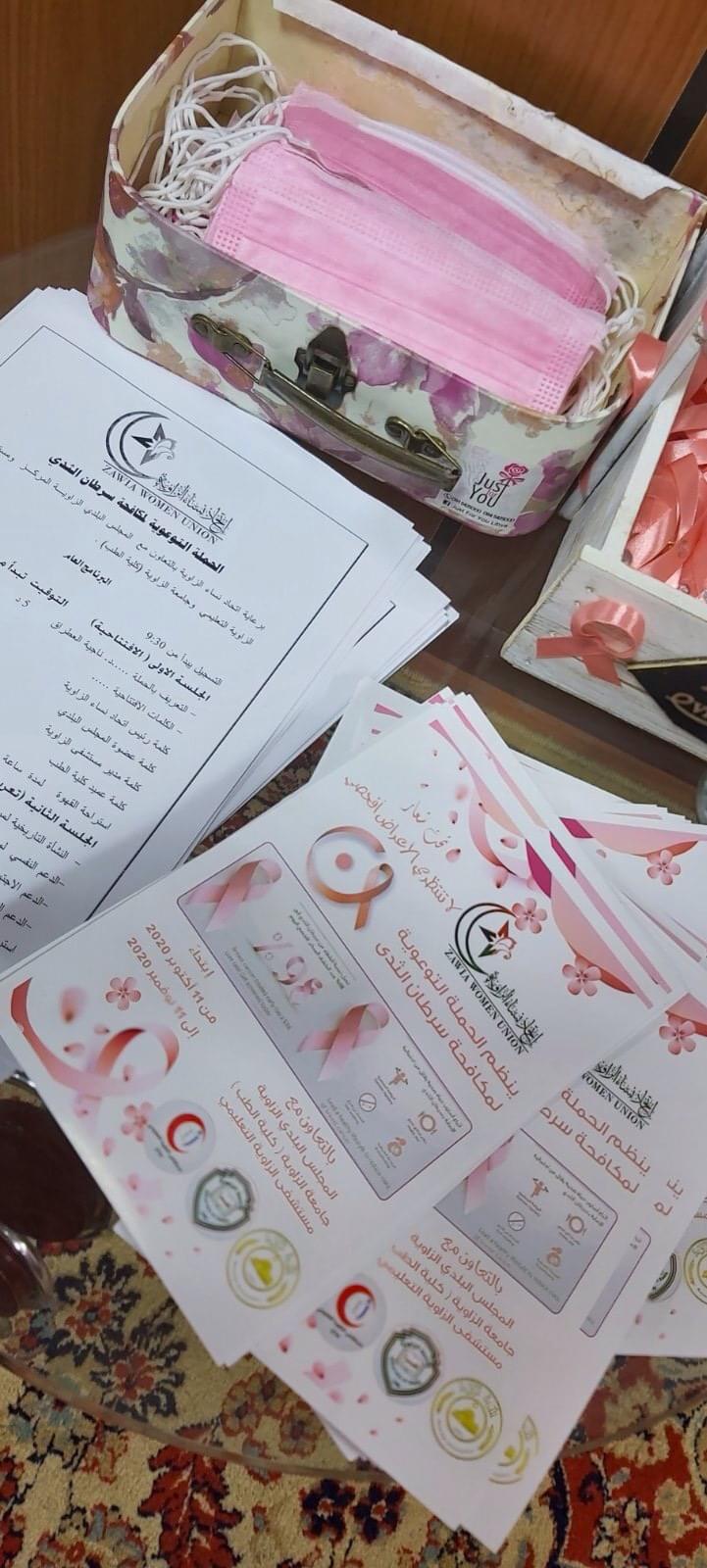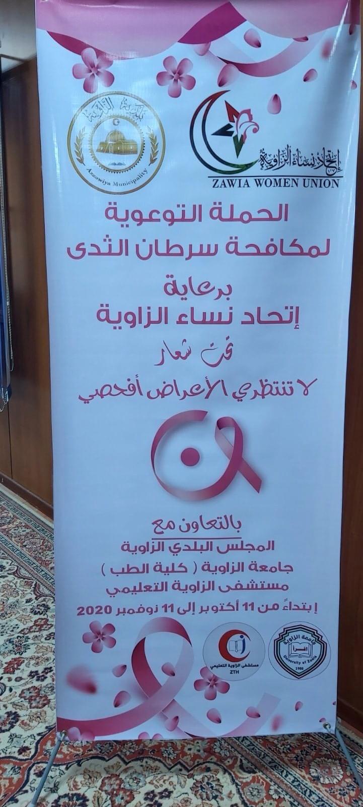 انطلقت يوم الاحد 10-11-2020 الحملة الوطنية للتوعية بسرطان الثدي برعاية اتحاد نساء الزاوية و تحت شعار لا تنتظري الاعراض افحصي و بالتعاون مع كل من كلية الطب البشري الزاوية و مستشفي الزاوية التعليمي و المجلس البلدي الزاوية و كان من ضمن فعاليات اليوم الاول القاء الكلمات من قبل المنظمين للحملة و كذلك القت الدكتورة نورية النسر و الدكتورة سمية دراء محاضرة بعنوان سرطان الثدي في قاعة الدكتور نورالدين خدير بمستشفي الزاوية التعلمي هذا وستتواصل الحملة التوعية من خلال المداخلات عبر وسائل الاعلام المحلية و الفرق الطبية الميدانية و التي ستتواجد بمستوصفات المنطقة الي غاية يوم الاربعاء 11-11-2020