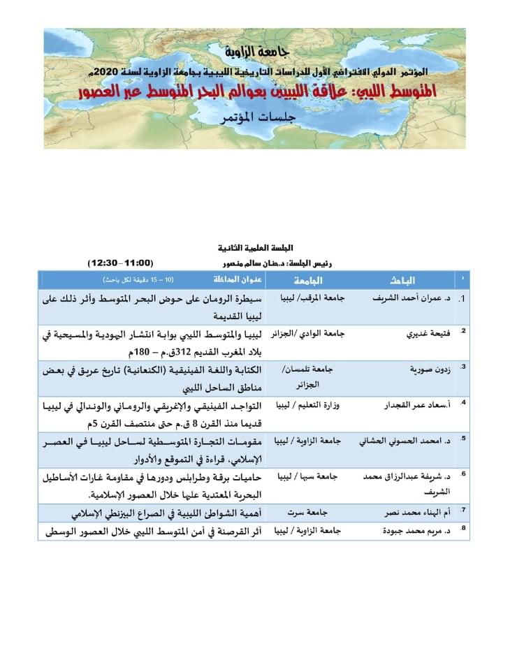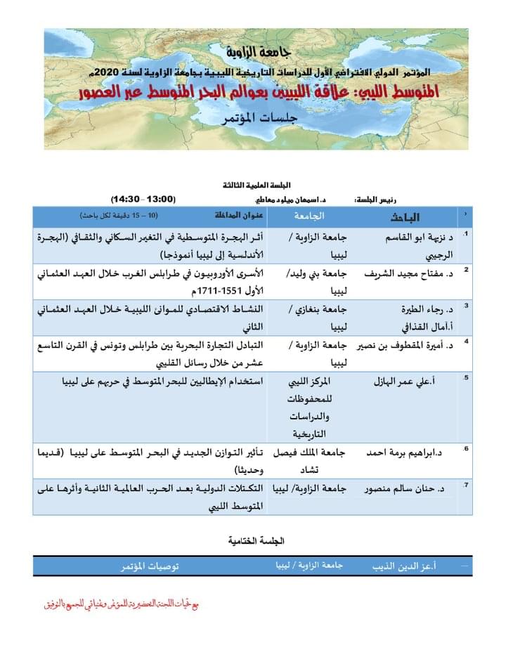 انطلاق الاستعدادات لانعقاد جلسات المؤتمر الدولي الافتراضي الأول للدراسات التاريخية الليبية بجامعة الزاوية 2020م المتوسط الليبي "علاقة الليبيين بعوالم البحر المتوسط عبر العصور"، والذي ينظمه قسم التاريخ بكلية الآداب بالزاوية برعاية وإشراف مركز البحوث والاستشارات العلمية بجامعة الزاوية، ويساهم في أعمال المؤتمر عبر جلسات علمية افتراضية عدد كبير من البحاث والمشاركين من الداخل والخارج وذلك يوم الأربعاء 25 نوفمبر 2020م، والدعوة عامة لكل المهتمين لمتابعة جلسات المؤتمر عبر تطبيق google meet))، وسوف ينشر رابط المشاركة للراغبين في المشاركين والتفاعل مع فعاليات المؤتمر الدولي الكبير .