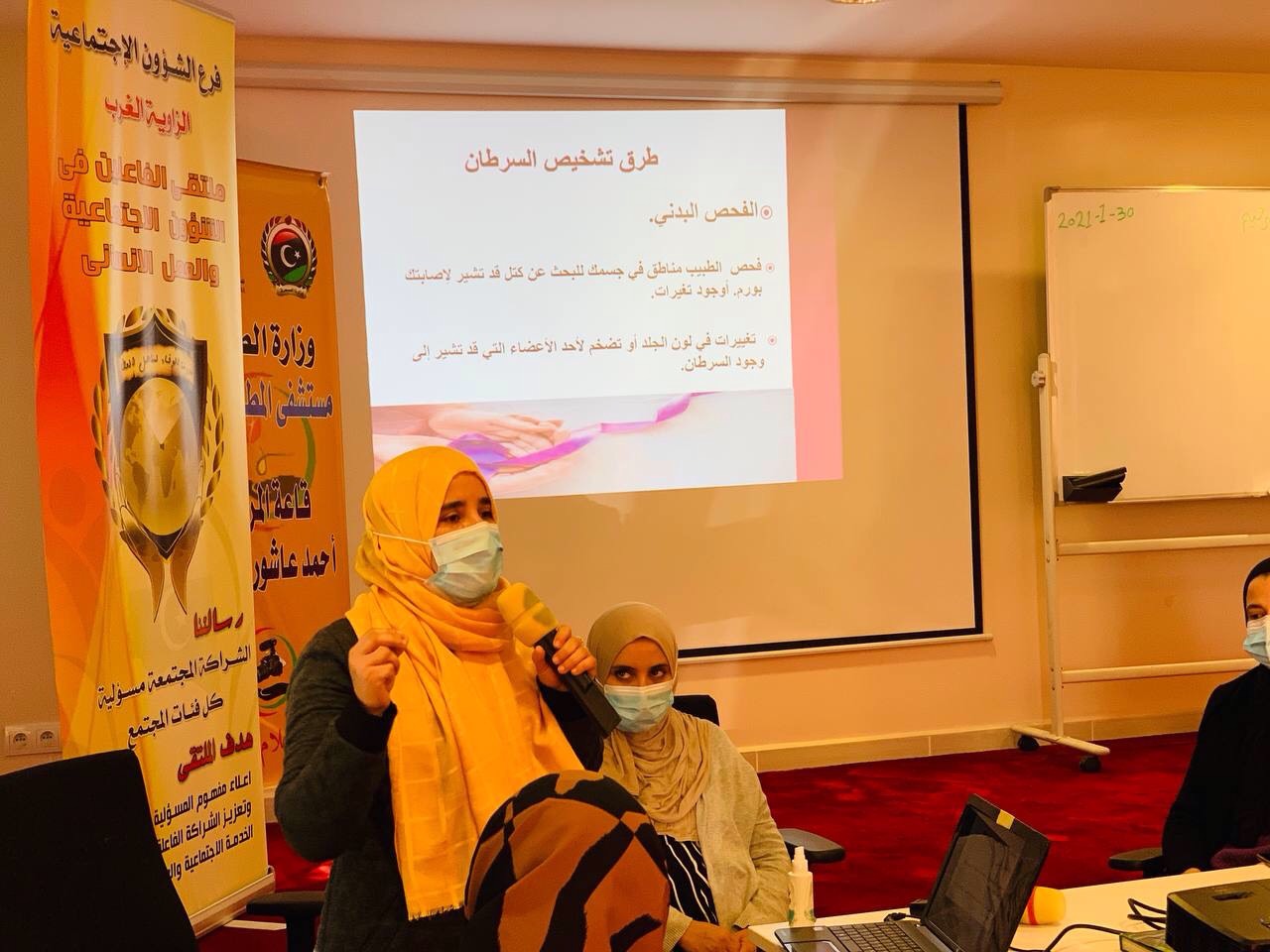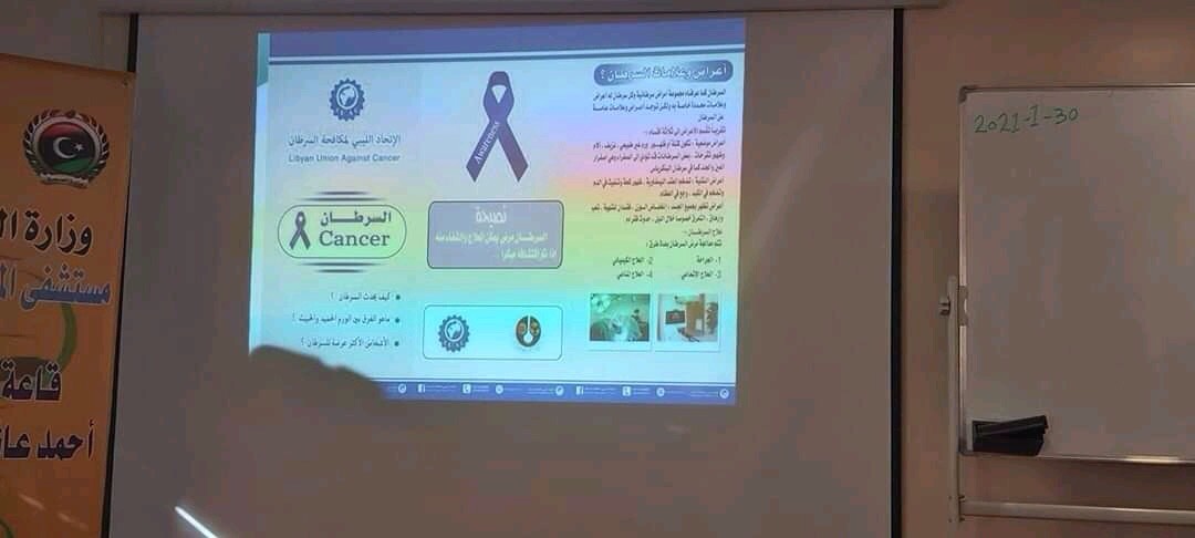 اقامت كلية الطب البشري بجامعة الزاوية و بالتعاون مع فرع الشؤون الاجتماعية بلدية الزاوية الغرب يوم الاربعاء 10-2-2021 بمستشفي المطرد العام يوم علمي بمناسبة اليوم العالمي للسرطان تم فيه القاء محاضرة توعية عن مرض السرطان من قبل الدكتورة مفيدة ختريش و محاضرة حول طرق تشخيص السرطان من قبل الدكتورة وفاء العلام كما و القيت بالمناسبة العديد من الكلمات من قبل منسقي النشاط العلمي بالكلية د شهرزاد القزيطي و د ريما المداح و د امل كوباس و القت الاستاذة نعيمة سلامة كلمة الشؤون الاجتماعية بلدية الزاوية الغرب وكان ايضا لطلبة كلية الطب مشاركة فعالة في النشاط العلمي بالمناسبة