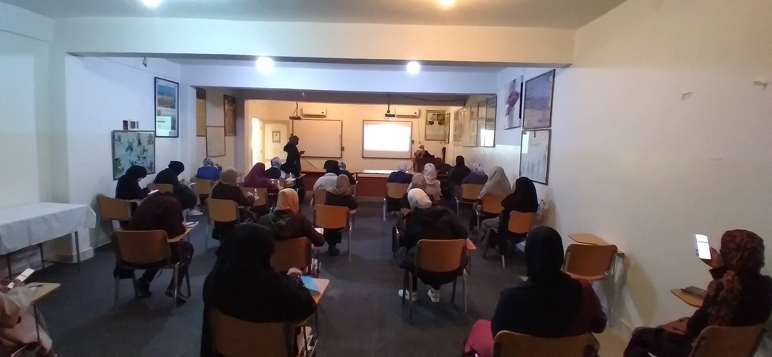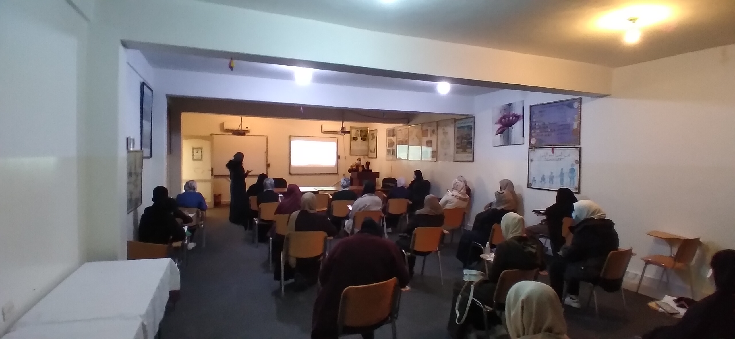 وقد قام بإدارة الورشة الاستاذة (نجوى اقجام) عضو هيئة التدريس بالقسم و التي بادرت بتقديم و التجهيز للورشة وبحضور عميد الكلية (د. الشريف الحراري) و مسجل الكلية (أ. حسن البرناوي) و حضر الورشة طالبات القسم و المعيدات وأعضاء هيئة التدريس.