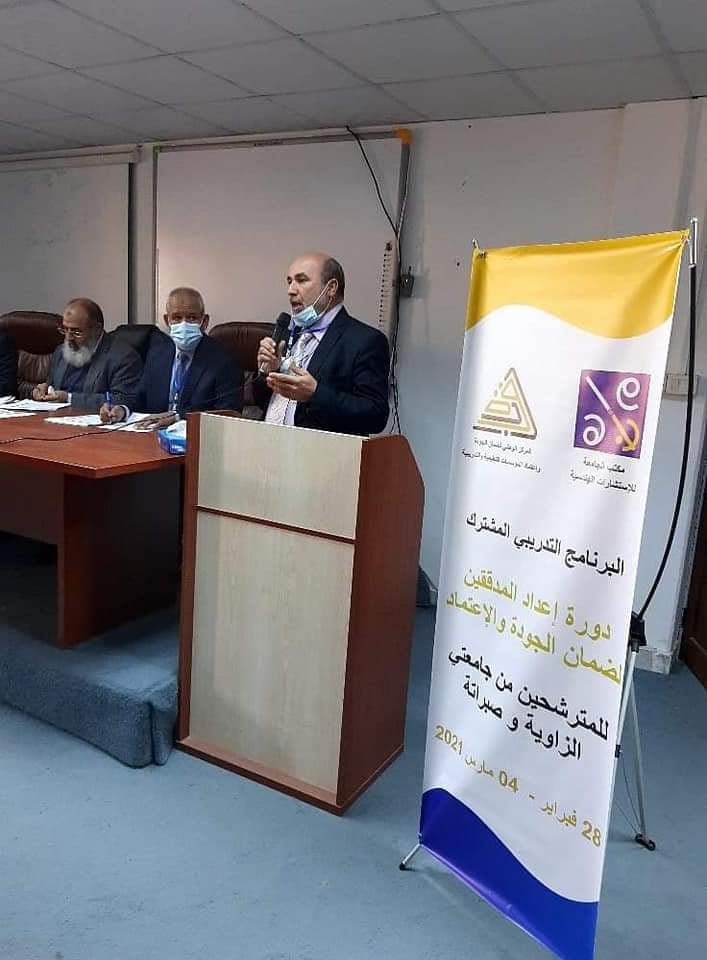 إستضافت كلية طب وجراحة الفم والاسنان بجامعة الزاوية يوم الخميس الموافق 4/3/2021 المتدربين (لدورة إعداد المدققين لمعايير ضمان الجودة والإعتماد) المرشحين من جامعتي الزاوية وصبراتة،،وتم توزيع شهائد إختتام البرنامج .