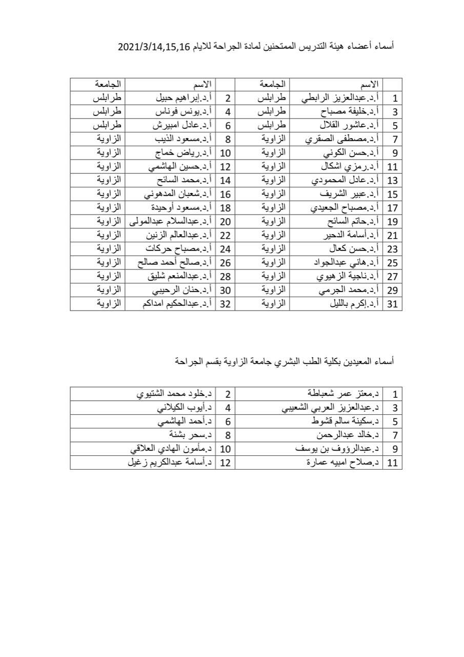 اختتم اليوم الثلاثاء الموافق 16-3-2021 الامتحان السريري الدور الثاني لمادة الجراحة للسنة الخامسة الدفعة 14 وذلك بأشراف رئيس قسم الجراحة د.محمد الزروق وبحضور عميد كلية الطب البشري د.نورية النسر ورئيس قسم الجودة د.إيناس الرميح كما تتقدم إدارة كلية الطب البشري بالشكر لكل من أعضاء هيئة التدريس الممتحنين من جامعة طرابلس وجامعة الزاوية والمعيدين والمعيدات اللذين شاركوا بالإشراف والمتابعة على الامتحان .