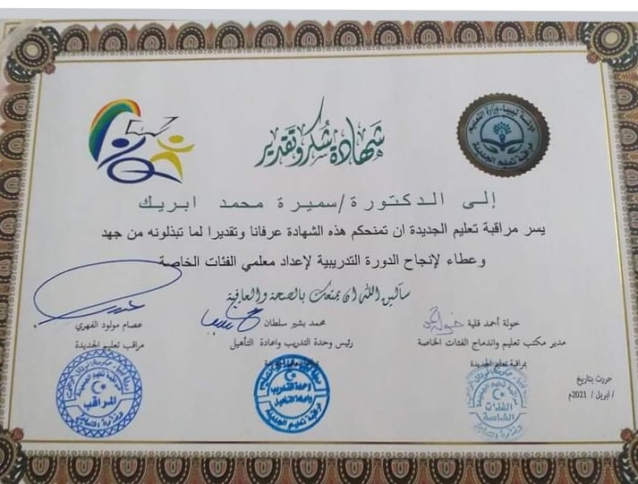في إطار التعاون المشترك بين الجامعة ومؤسسات الدولة وفي إطار خدمة المجتمع هناك كوكبة من القامات العلمية بكلية التربية العجيلات تساهم وتقدم كل ما لديها من أجل الرفع والرقي بمؤسسات الدولة أينما كانت ها هي الدكتورة سميرة محمد بريك أحد القامات العلمية والإدارية بكلية التربية العجيلات يتم تكريمها يوم أمس الخميس 8-4-2021 على اهتمامها الدائم بالتعاون مع الكل من أجل دولتنا نتمنى لها التوفيق الدائم