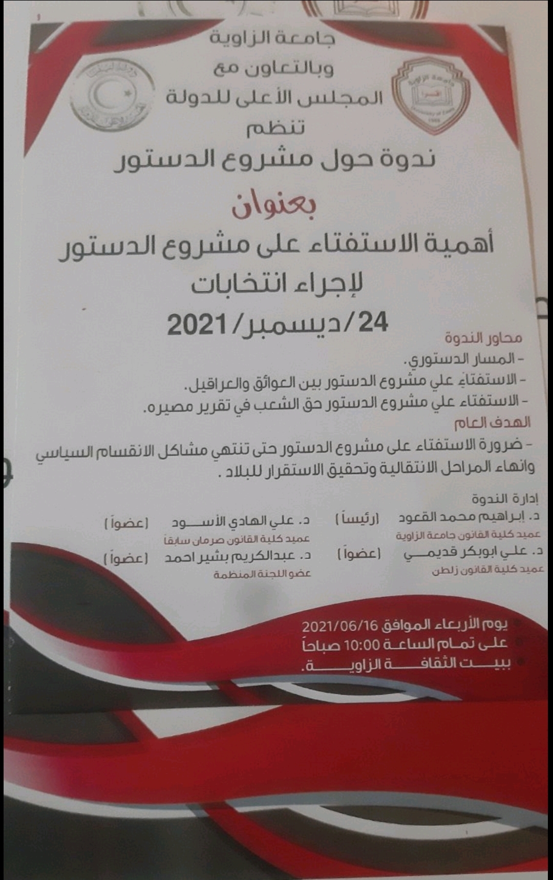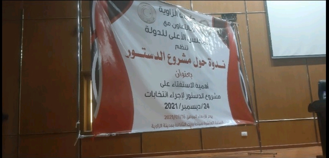 أقيمت اليوم الإربعاء 16 يونيو 2021 بدار الكتاب بالزاوية، ندوة علمية حول مشروع الدستور بعنوان: ( أهمية الاستفتاء على مشروع الدستور لإجراء انتخابات 24ديسمبر2021 )