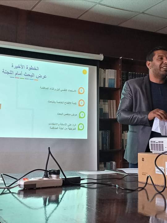 نظم قسم القانون العام بالتعاون مع قسم شؤون المكتبة بكلية الشريعة والقانون العجيلات اليوم الاثنين الموافق: 7 مارس 2022 ورشة عمل حول كيفية كتابة البحث العلمي و تأهيل الطالب نفسياً للمناقشة أمام اللجنة أثناء إلقاء بحثه