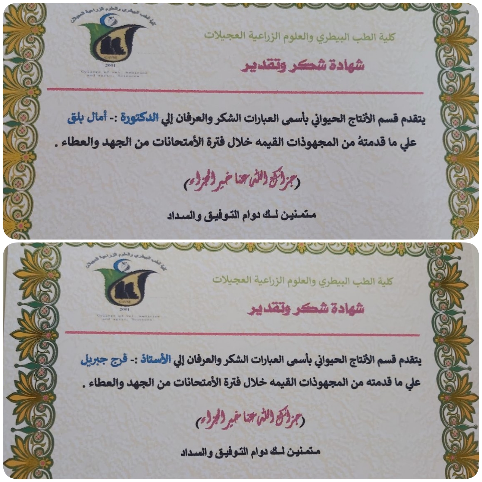 اقام قسم الإنتاج الحيواني برئاسة السيد رئيس القسم الدكتور عبدالحكيم العر وبمناسبة إختتام الإمتحانات النهائية لهذا الفصل ؛ حفل تكريم لأعضاء اللجنة العليا للإمتحانات بكلية الطب البيطري و العلوم الزراعية و ذلك لجهودهم التي بُذلت في سبيل سير عملية الإمتحانات في أحسن الظروف.